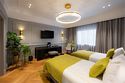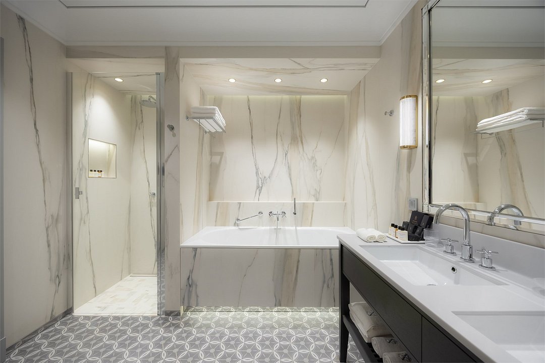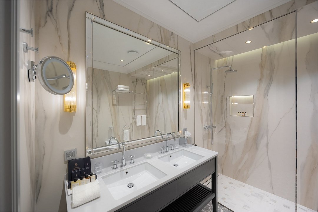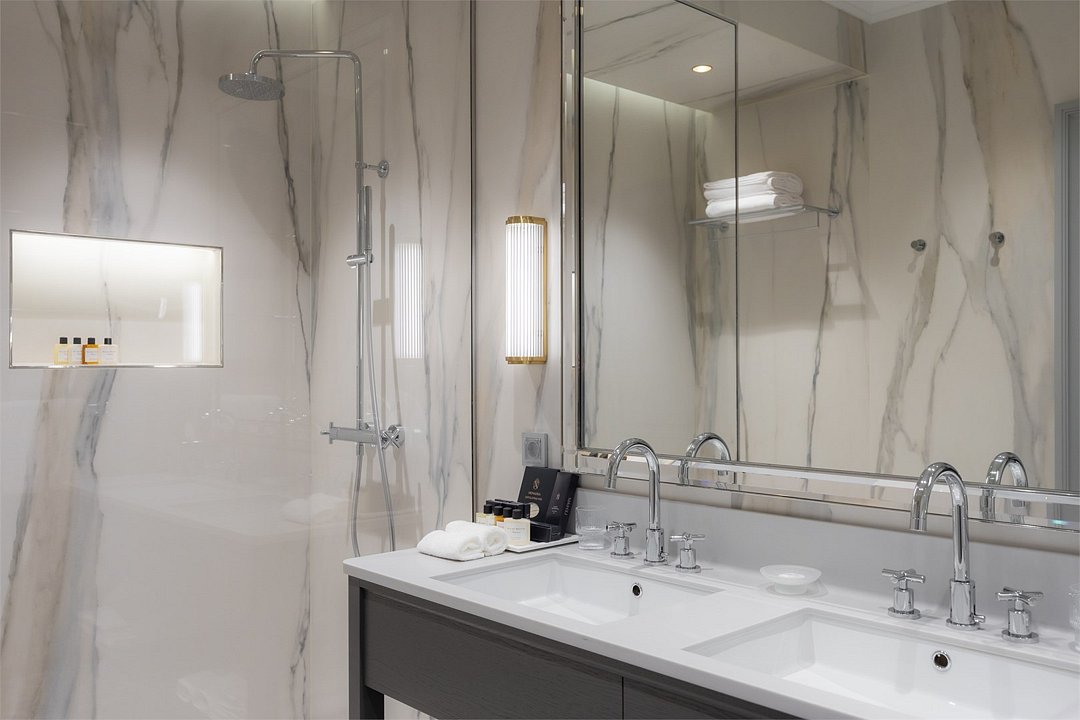Wi-Fi, кондиционер, фен, кофемашина, биде, халаты, банные полотенца, тапочки, косметические средства, кровать «King size», две односпальные кровати, кресла, тумбы, шкаф для одежды, гардеробная, журнальный столик, письменный стол, мини-бар, сейф, душ, вид на парк, телевизор с плоским экраном, номер для некурящих, пуфик, система умный дом, чайная станция, затемняющая штора, без питомцевВ гостиничном номере