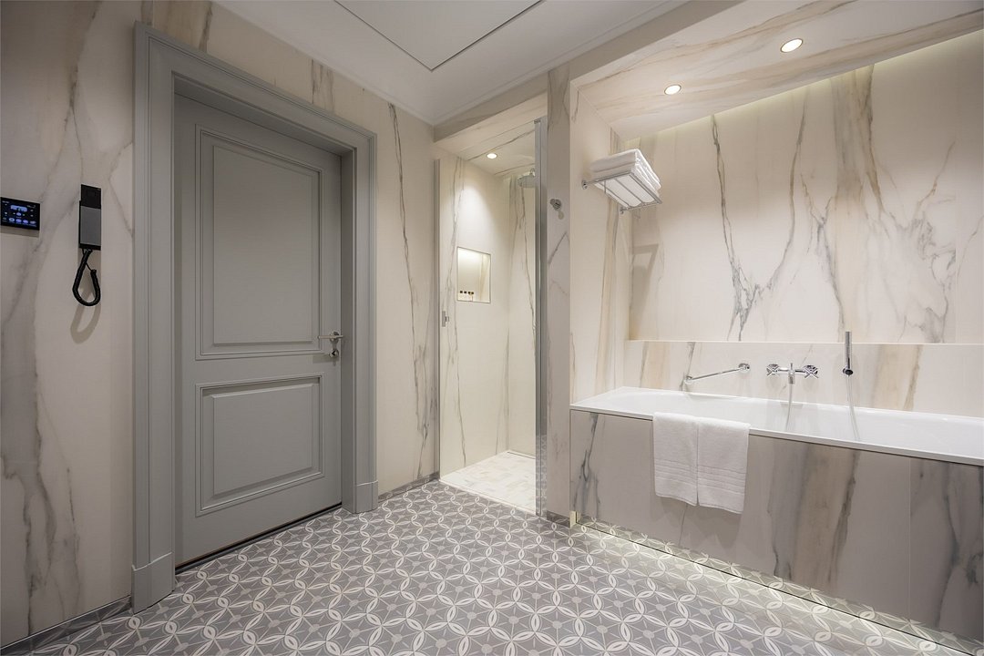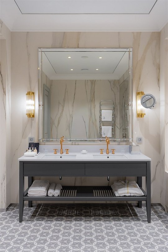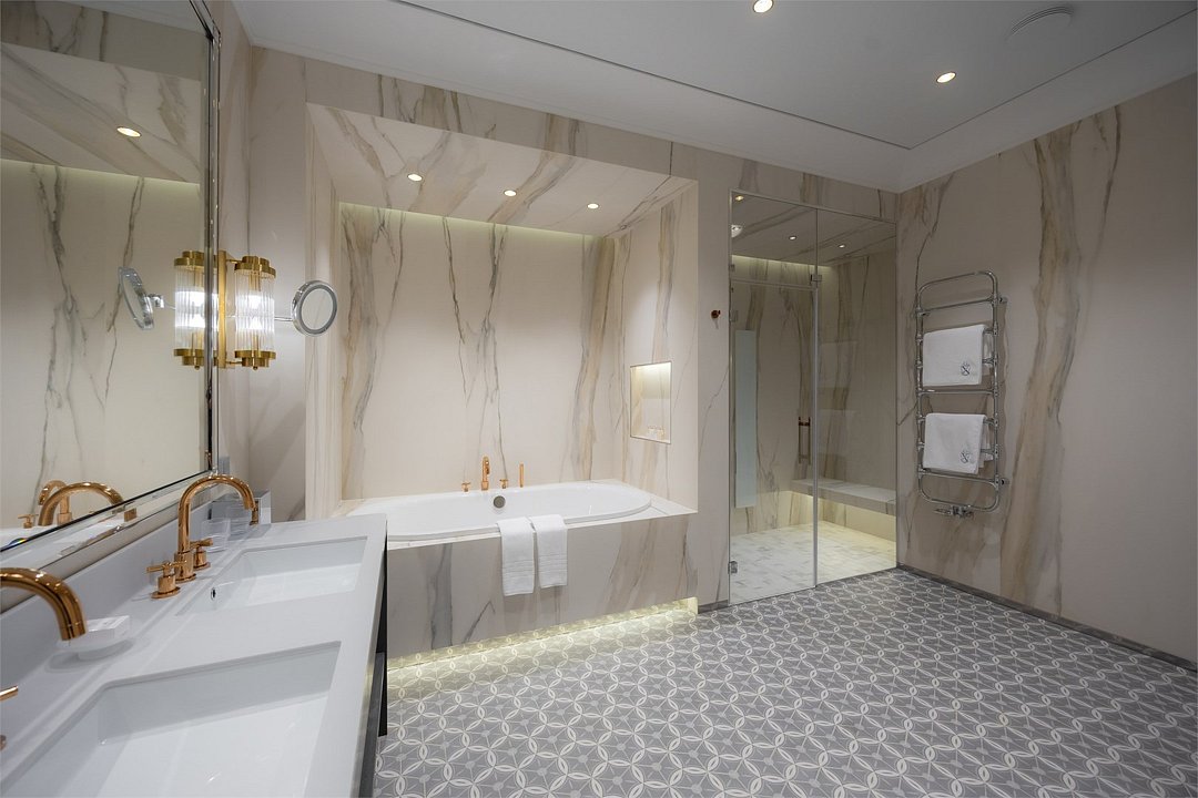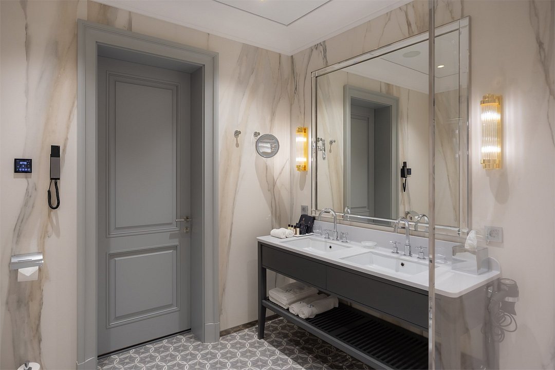 Wi-Fi, кондиционер, фен, кофемашина, биде, халаты, косметические средства, кровать «King size», двуспальная кровать, кресла, тумбы, гардеробная, журнальный столик, письменный стол, мини-бар, чайный набор, сейф, душ, вид на реку, паркет, телевизор с плоским экраном, номер для некурящих, пуфик, система умный дом, без питомцевВ гостиничном номере