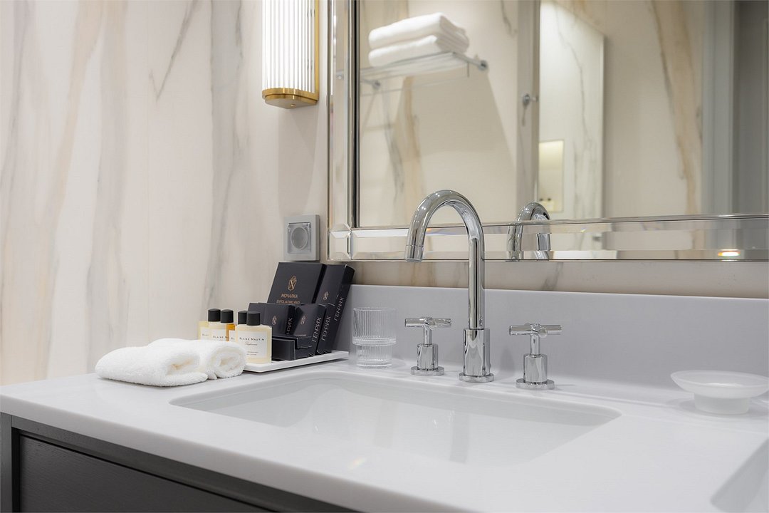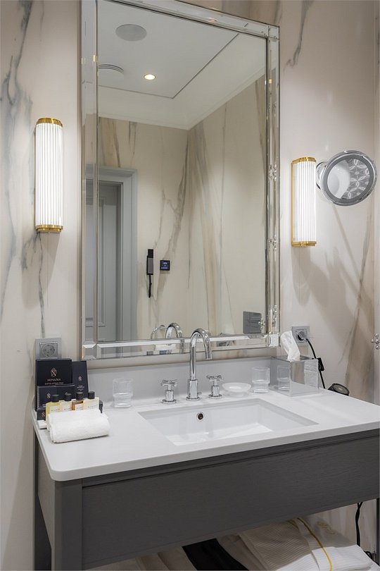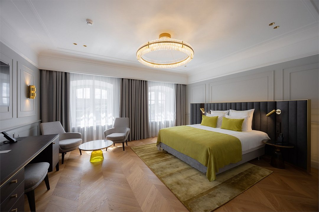 Wi-Fi, кондиционер, фен, кофемашина, ванна, биде, халаты, тапочки, косметические средства, кровать «King size», двуспальная кровать, журнальный столик, письменный стол, ковер, мини-бар, сейф, душ, вид на реку, паркет, раскладной диван, телевизор с плоским экраном, номер для некурящих, пуфик, система умный дом, чайная станция, затемняющая штора, без питомцевВ гостиничном номере