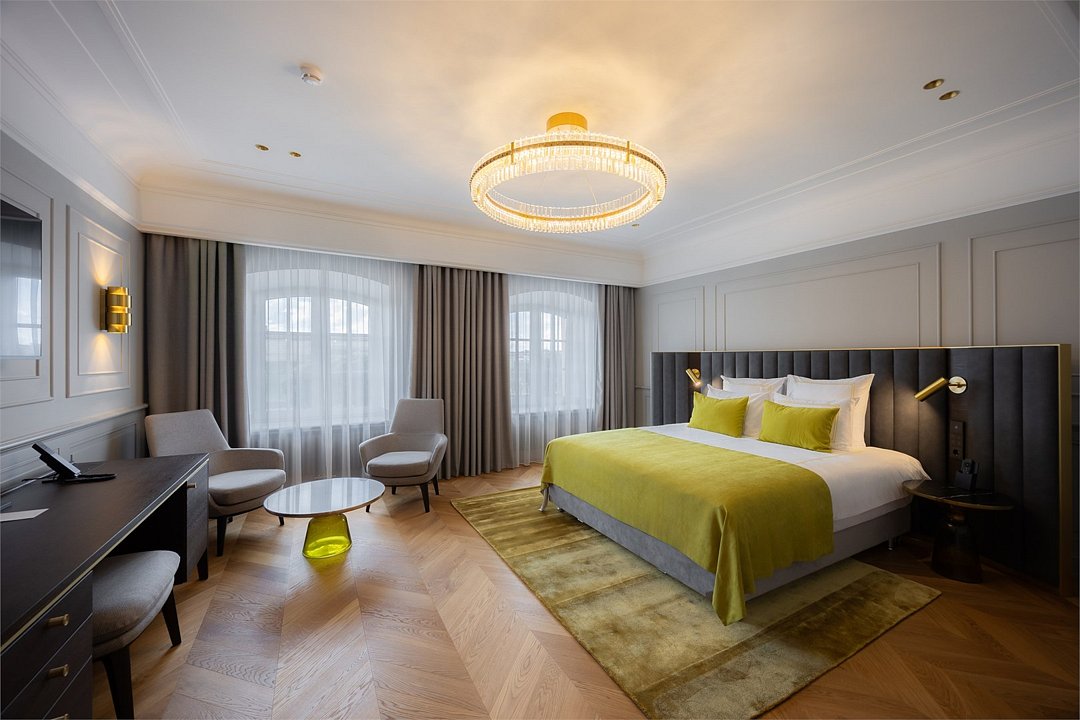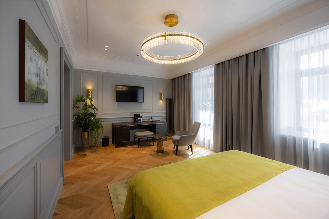 Wi-Fi, кондиционер, фен, кофемашина, биде, халаты, тапочки, гигиенические средства, кровать «King size», диван, кресла, тумбы, гардеробная, журнальный столик, письменный стол, ковер, мини-бар, сейф, душ, вид на реку, паркет, телевизор с плоским экраном, номер для некурящих, пуфик, система умный дом, чайная станция, затемняющая штора, без питомцевВ гостиничном номере