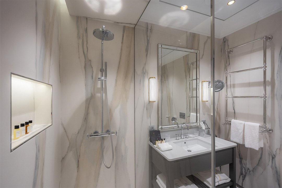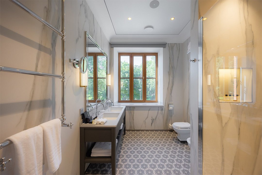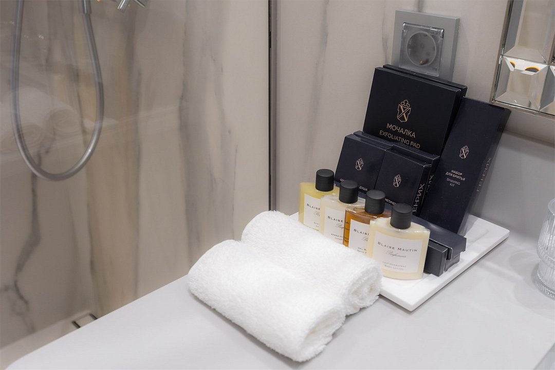 Wi-Fi, кондиционер, фен, биде, халаты, банные полотенца, тапочки, косметические средства, кровать «King size», кресла, тумбы, гардеробная, журнальный столик, письменный стол, мини-бар, сейф, чайник, душ, вид на реку, паркет, телевизор с плоским экраном, номер для некурящих, пуфик, система умный дом, веранда, затемняющая штора, без питомцевВ гостиничном номере
