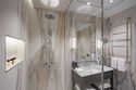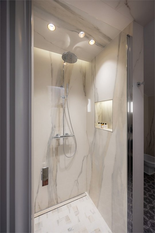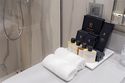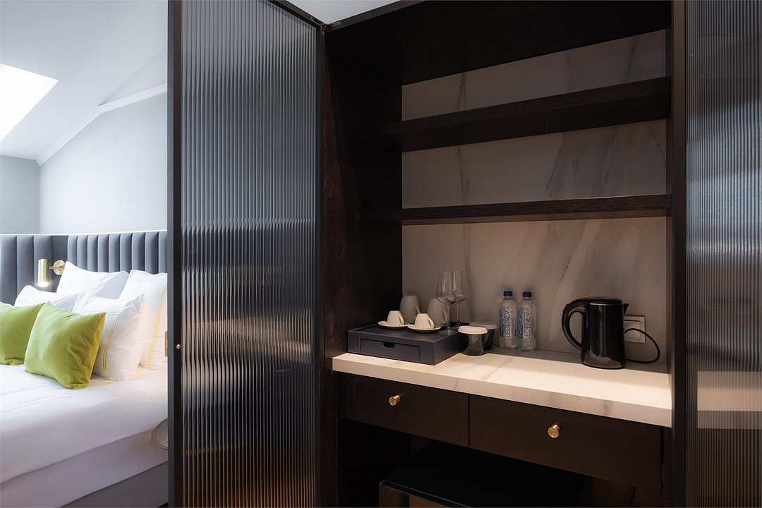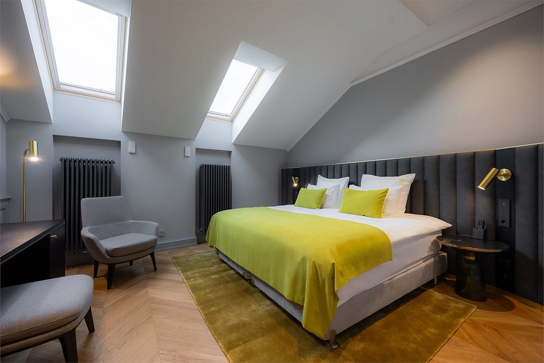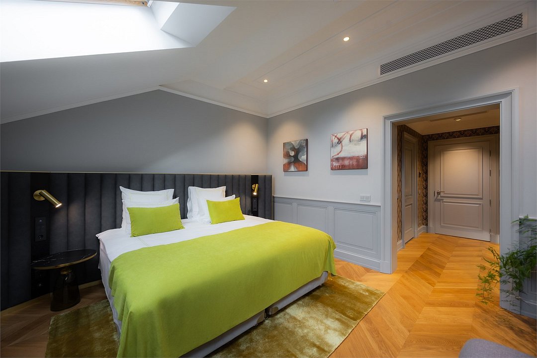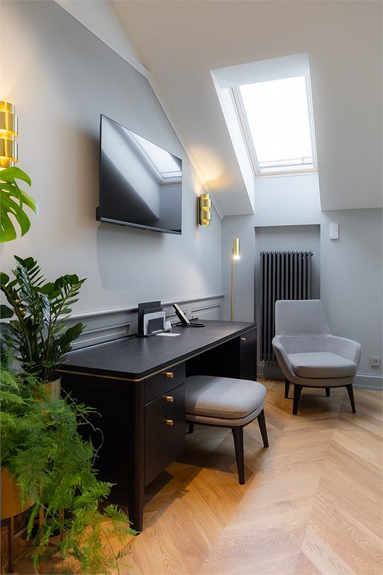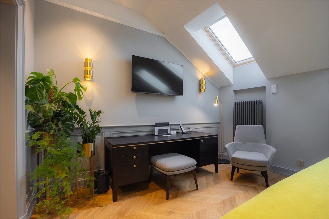 Wi-Fi, кондиционер, фен, кофемашина, биде, халаты, тапочки, косметические средства, кровать «King size», две односпальные кровати, кресла, гардеробная, журнальный столик, письменный стол, ковер, сейф, чайник, душ, паркет, телевизор с плоским экраном, мансардные окна, номер для некурящих, пуфик, система умный дом, затемняющая штора, без питомцевВ гостиничном номере