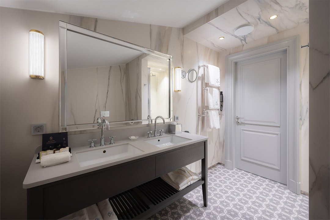 Wi-Fi, кондиционер, фен, кофемашина, ванна, халаты, банные полотенца, тапочки, косметические средства, кровать «King size», кресла, тумбы, гардеробная, журнальный столик, письменный стол, ковер, две комнаты, мини-бар, сейф, гостиная зона, душ, вид на реку, паркет, раскладной диван, телевизор с плоским экраном, номер для некурящих, система умный дом, чайная станция, туалетные принадлежности премиум-класса, затемняющая штора, косметические принадлежности премиум-класса, без питомцевВ гостиничном номере