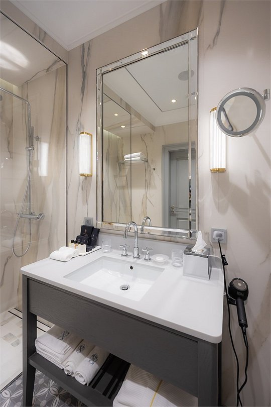 Элегантные и просторные гостевые номера оформлены в спокойных тонах, а из окон открывается захватывающий вид на Кремль. Ванная комната оснащена душевой кабиной.Услуги и удобства
