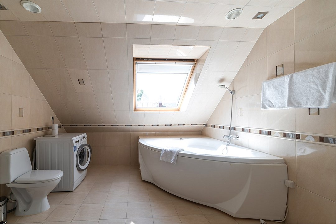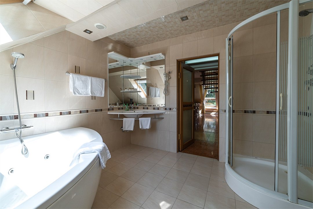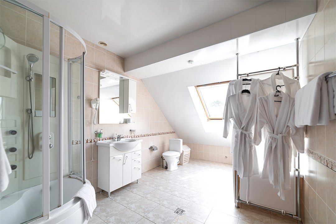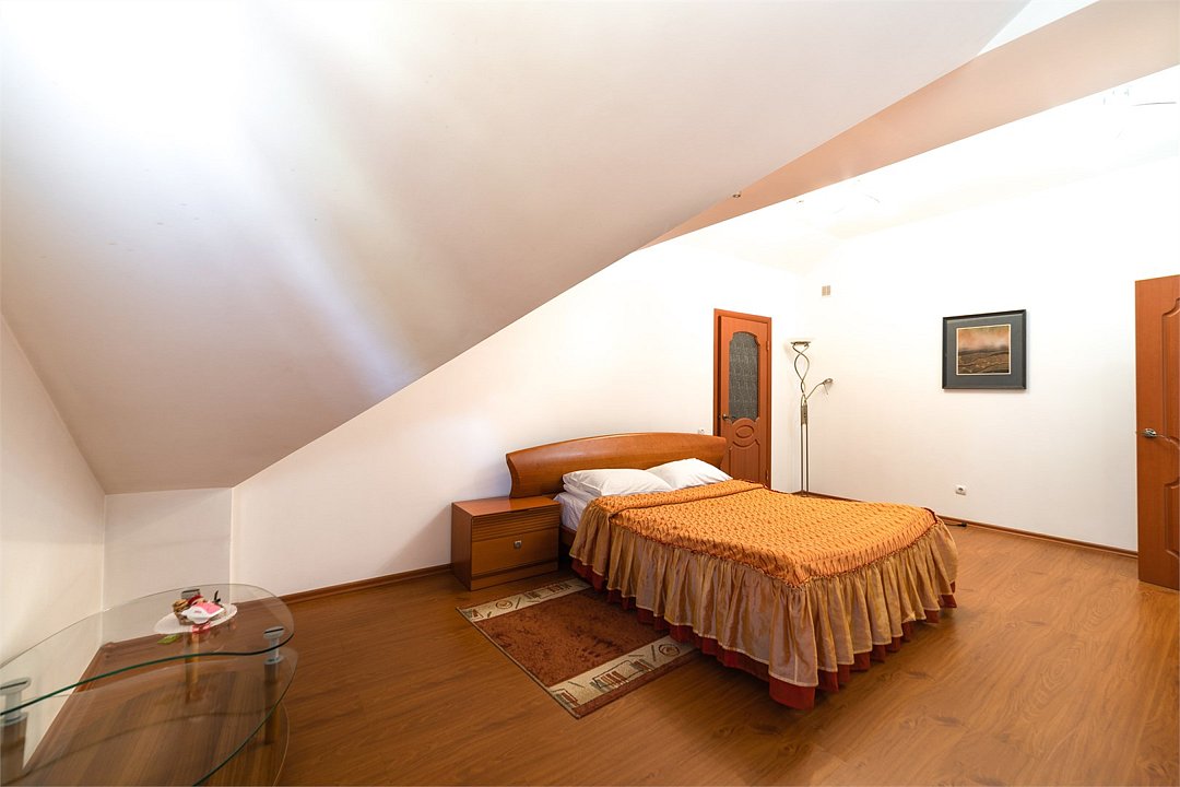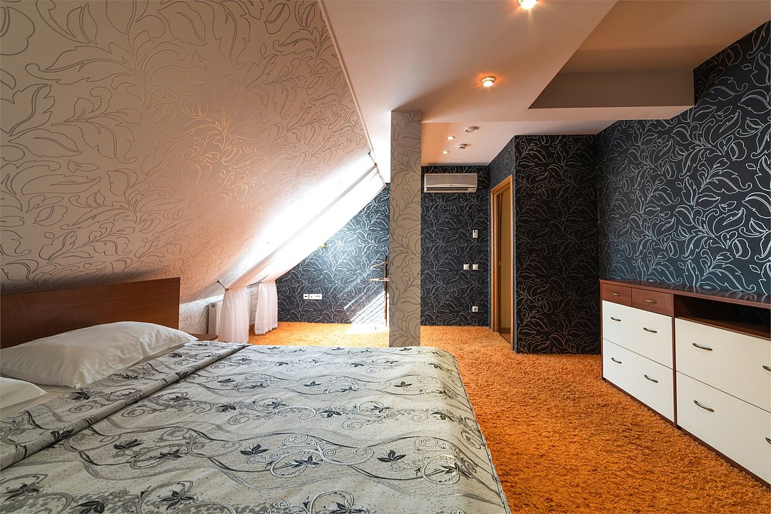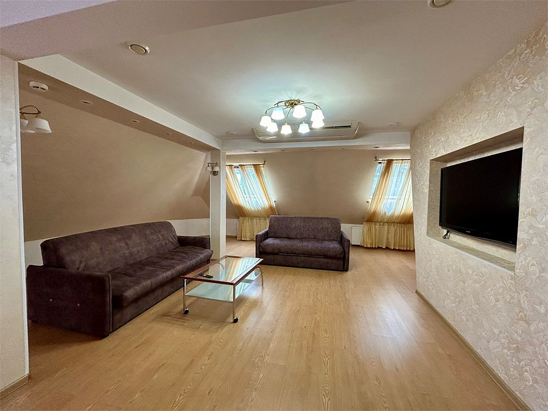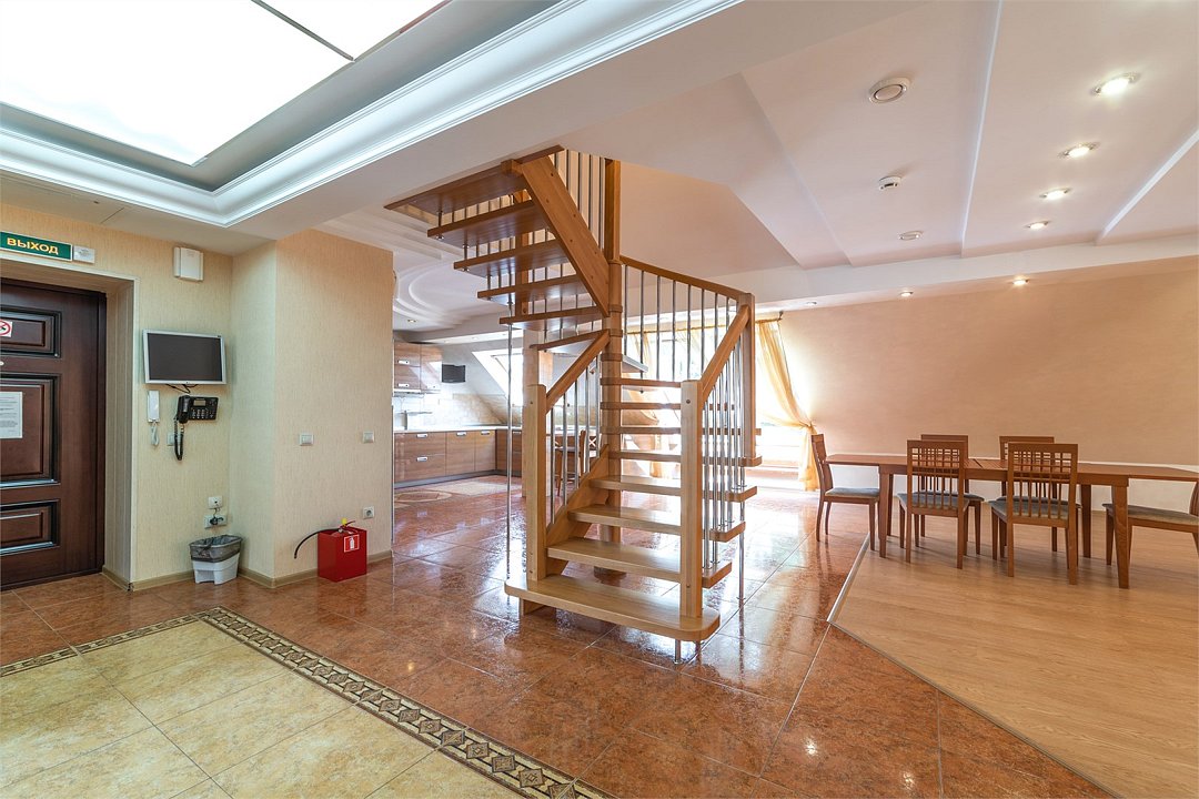 Двухуровневые апартаменты для 4-х взрослых (площадь 120 кв.м.) – апартаменты с кондиционером располагаются на двух уровнях (второй уровень – мансарда). Номер имеет 2 спальни и 2 санузла, в одном из которых – гидромассажная ванна-джакузи и стиральная машина. В общей кухне-гостиной со всей необходимой бытовой техникой, можно приготовить еду и собраться за общим столом или комфортно расположиться на диванах перед плазменным TV. В собственной ванной комнате имеются бесплатные косметические принадлежности, предоставляются халаты. По запросу в номер может быть предоставлена детская кроватка (бесплатно). Дополнительное место организуется на диване в гостиной (платно).Услуги и удобства