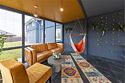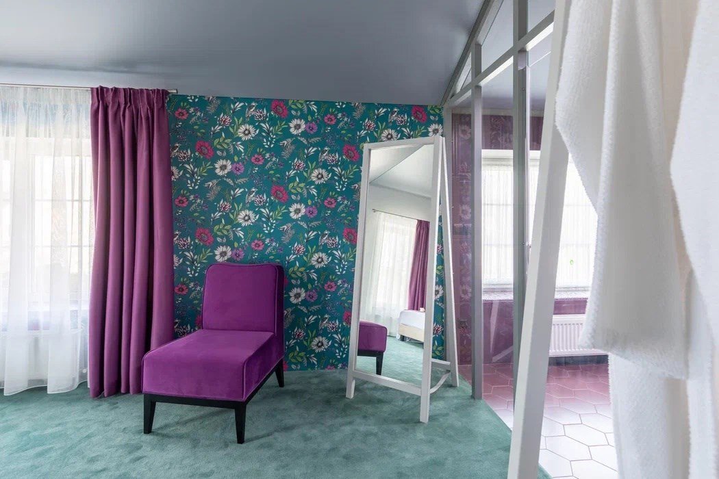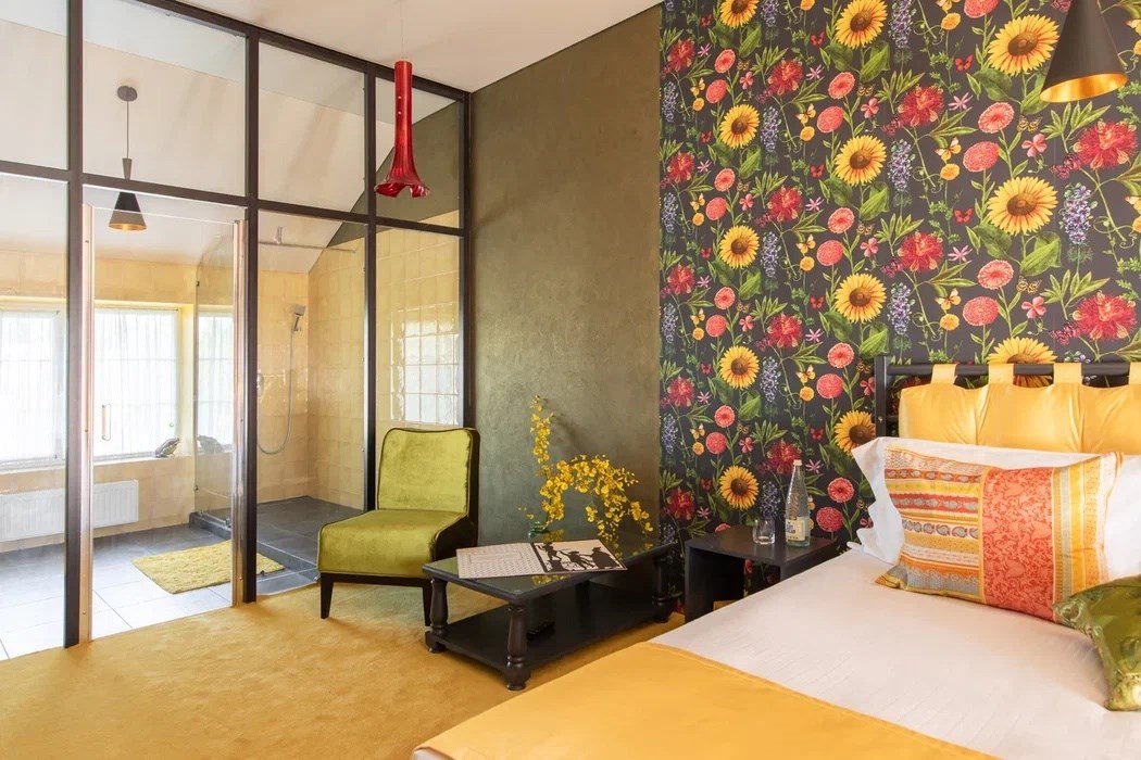 кабельное телевидение, Wi-Fi, тапочки, терраса, двуспальная кровать, вешалки, зеркало, пуфики, эксклюзивная мебель, унитаз, раковина, мягкая мебель, питьевая вода, ковровое покрытие, душ, вид на сад, туалетные средства, туалет, панорамные окна, телевизор с плоским экраном, номер для некурящих, частный двор, можно с питомцамиВ гостиничном номере