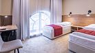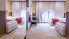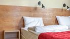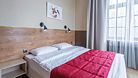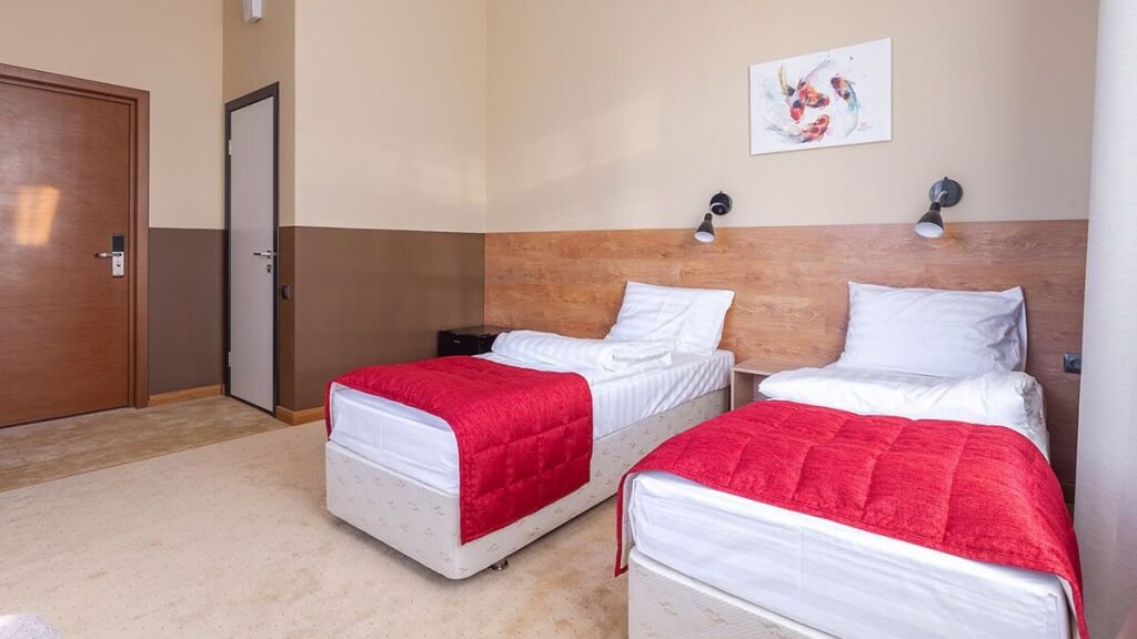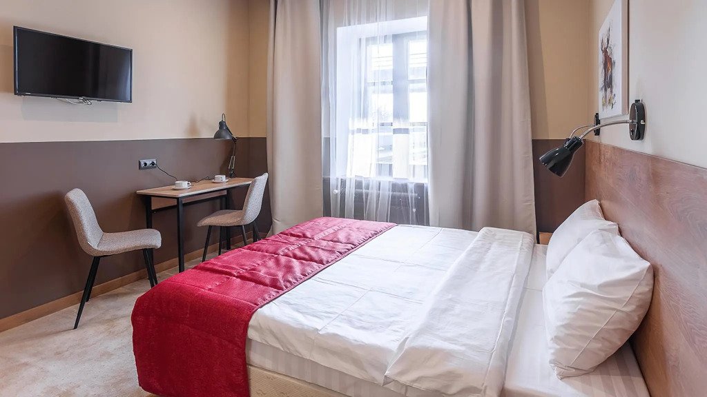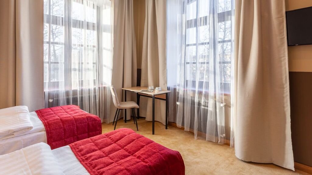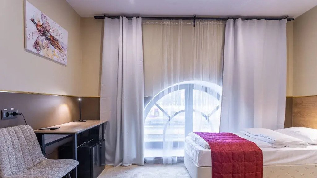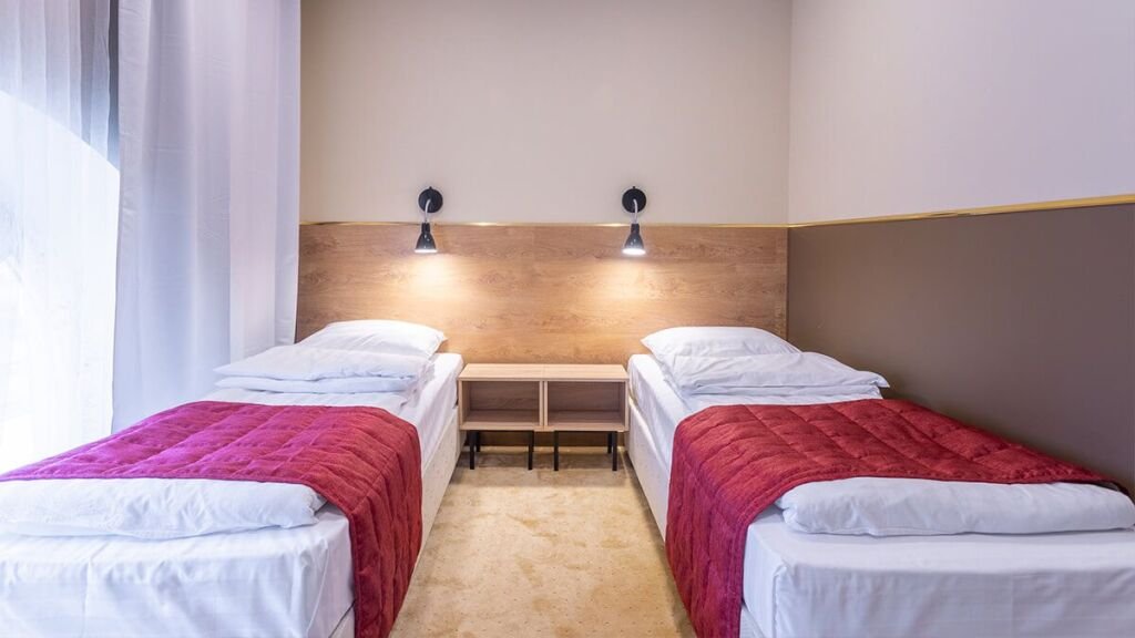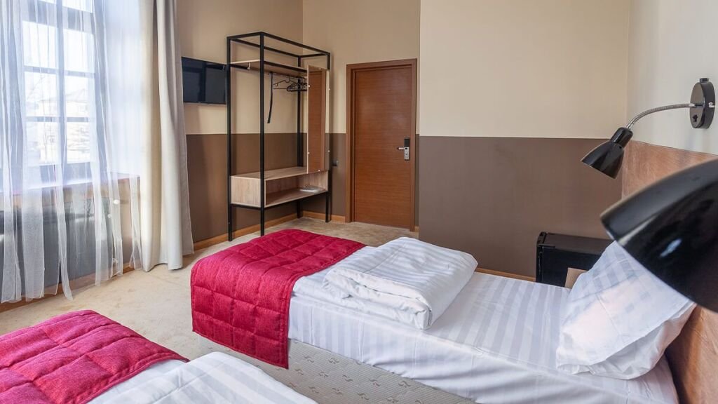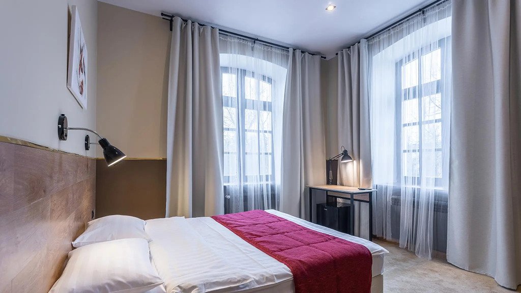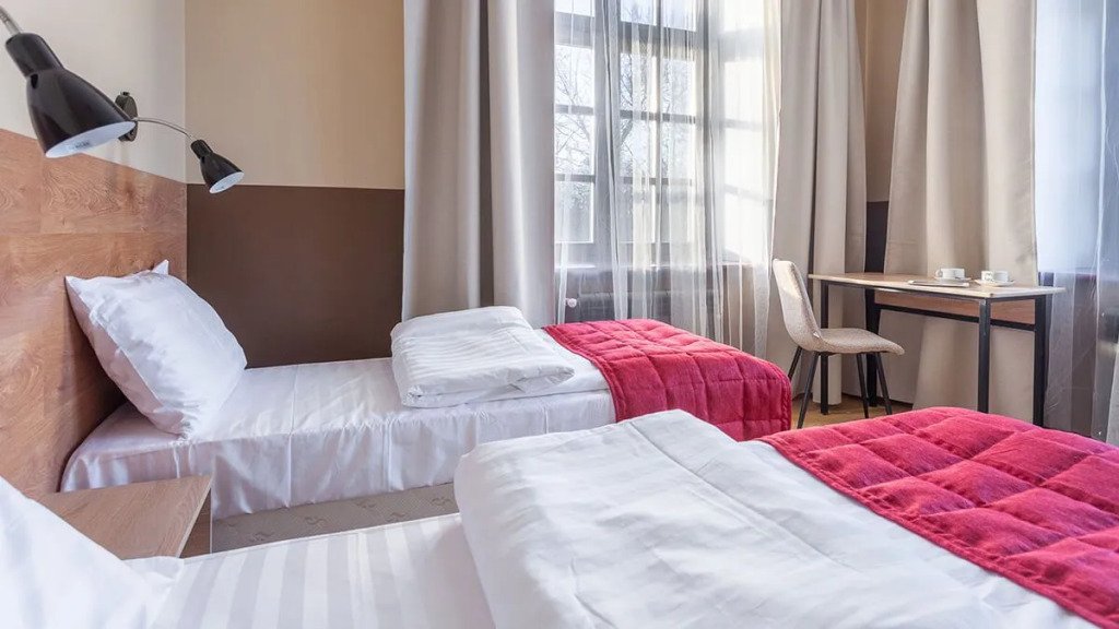 Номера оформлены в тёплых тонах. В каждом номере имеются ортопедические матрасы, звукоизоляция и плотные шторы. Предоставляется постельное бельё.