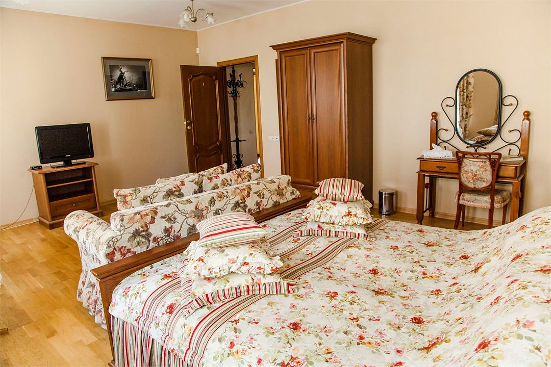 Комната расположена на втором этаже гостевого дома, с видом на Мирожский монастырь, площадь комнаты более 30 квадратных метров.
