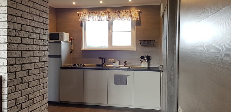 - Телевизор, холодильник, газовая плита, СВЧ-печь, тостер, душ, фен, тёплый пол, постельное бельё, посуда и столовые приборы для 2 человек.