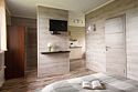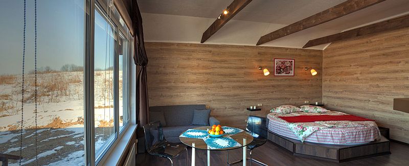 - Круглая двуспальная кровать king size (220 см) и дополнительное спальное место на диване (140 см);
