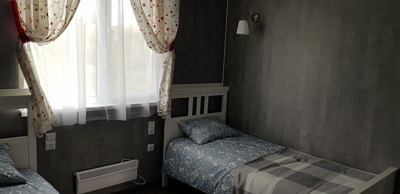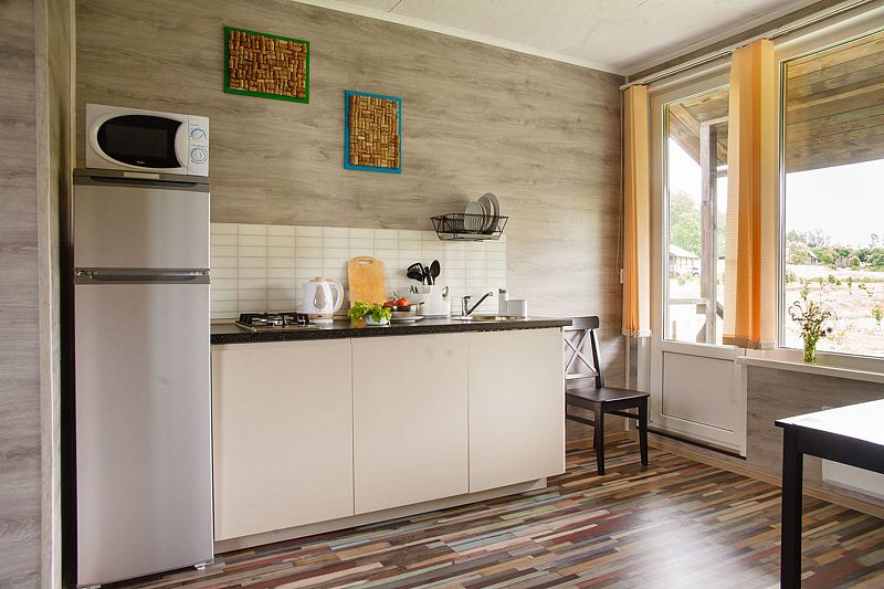 - Телевизор, холодильник, газовая плита, СВЧ-печь, тостер, душ, фен, тёплый пол, постельное бельё, посуда и столовые приборы для 4 человек;