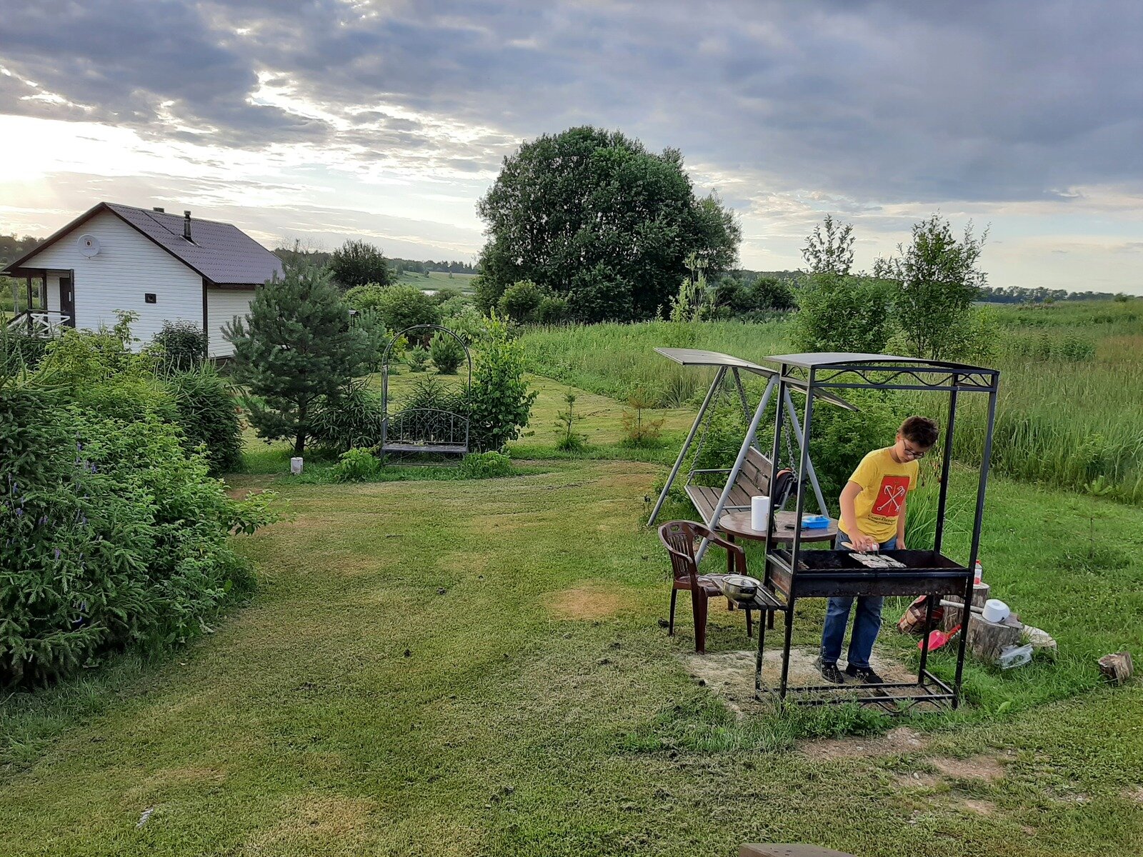 - Всё для отдыха на природе: мангал, шампуры, решётка, опахало, садовый стол и садовые качели;