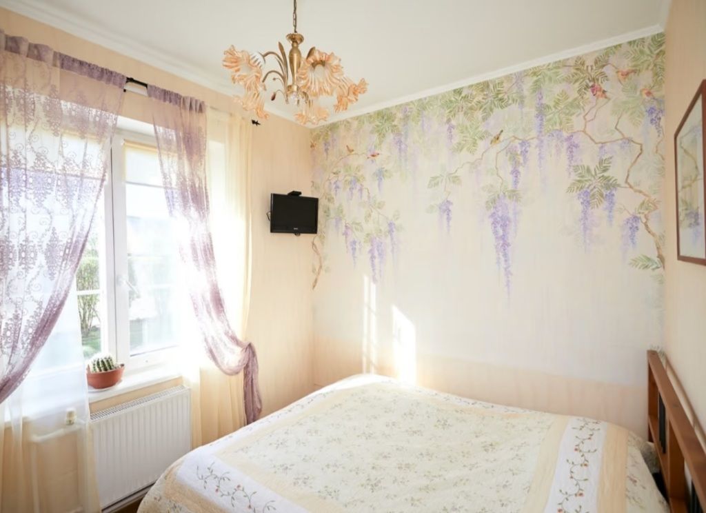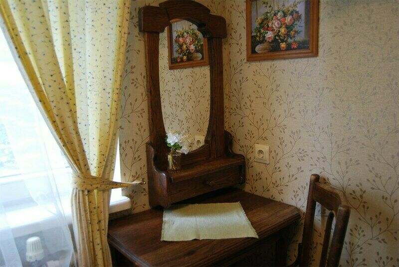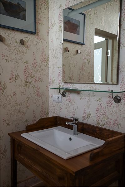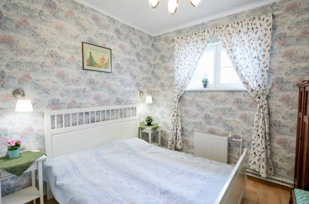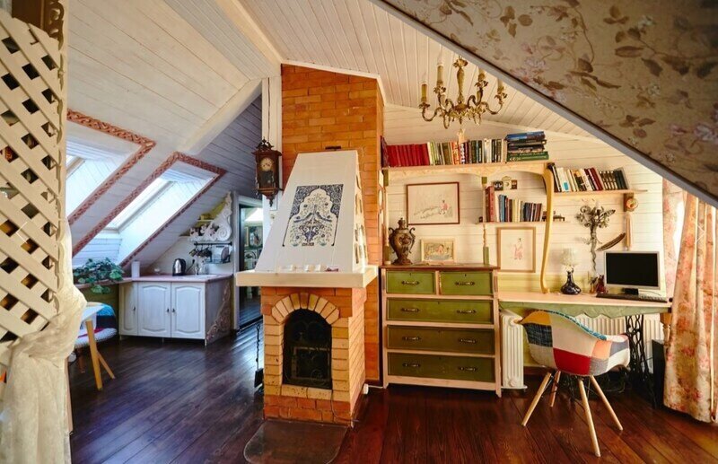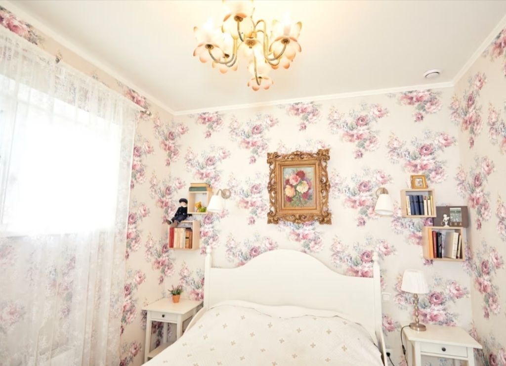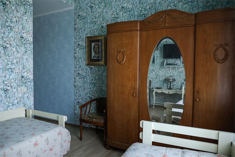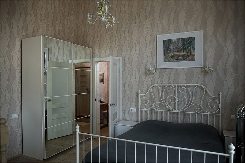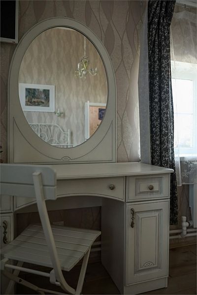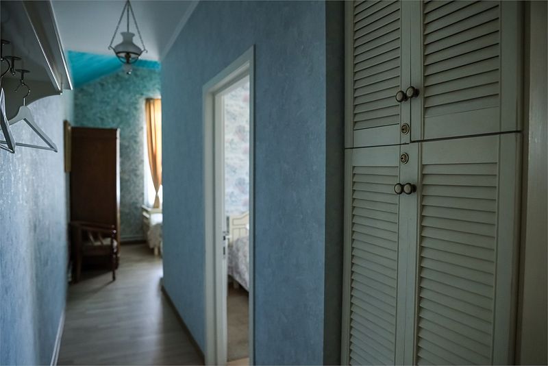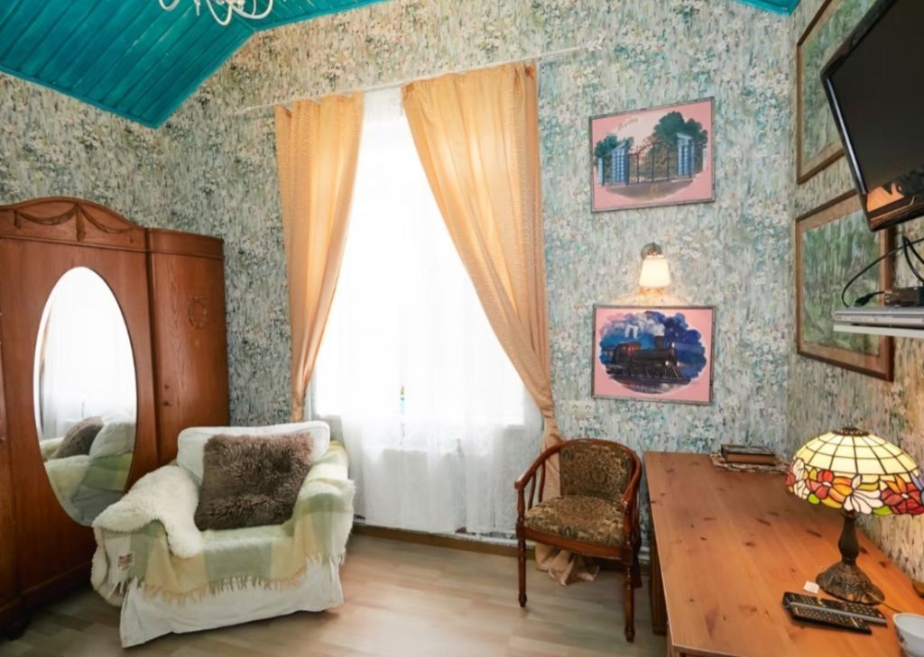 Дизайн помещений выдержан в милом мещанском стиле дворянских имений времен Пушкина. Цветочные обои, обои с зимнем пейзажем, статуэточки, картины, кружева, оборочки, цветные одеяла, множество милых вещиц составляют уютную душевную атмосферу этого места.