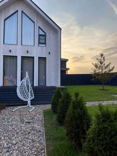 На территории расположены два кресла-кокона, зона для костра с садовыми креслами и мангал для приготовления блюд на свежем воздухе.