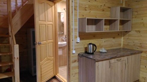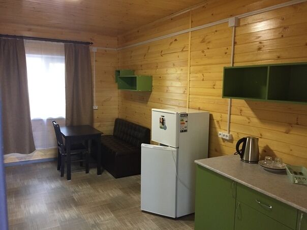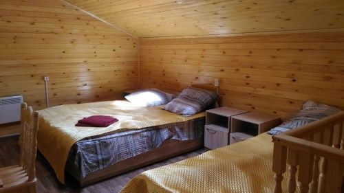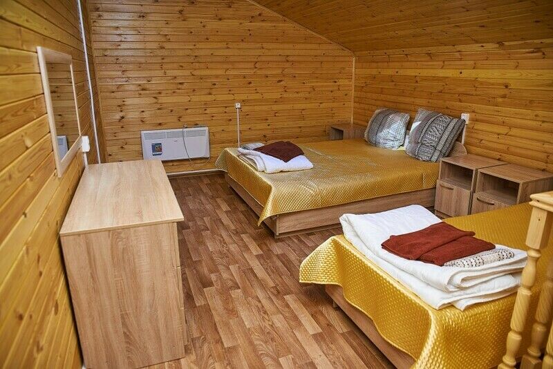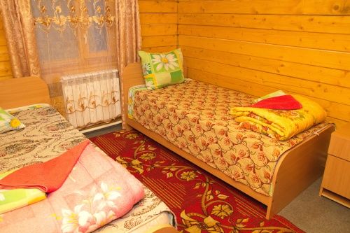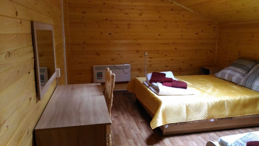 3-местный двухуровневый номер в коттедже. На 1 этаже комната отдыха (телевизор, холодильник, чайник), туалет, душ. На 2 этаже спальня.