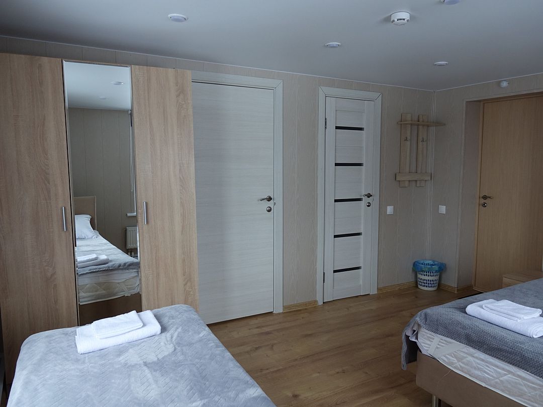 2х-комнатный номер с 1 двуспальной кроватью и 1 односпальной кроватью. Санузел (душ)