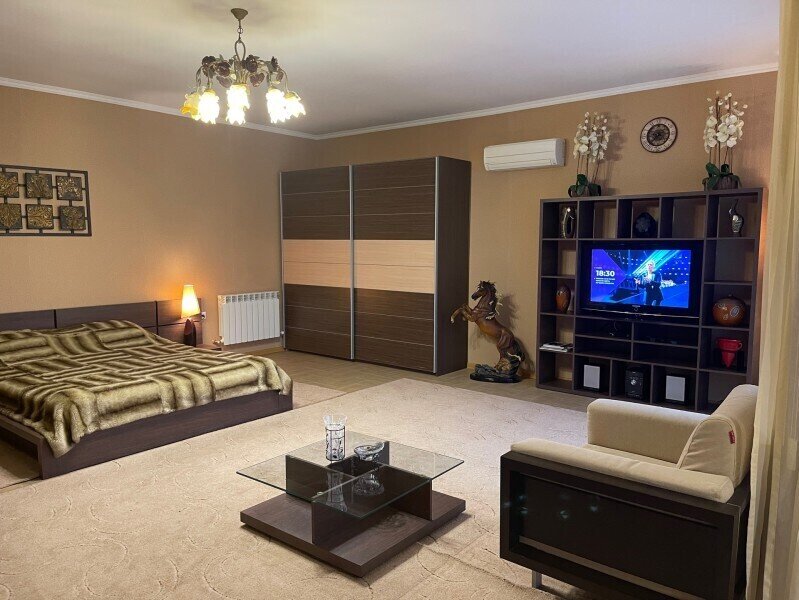 В номере 1 двуспальная кровать, мягкая мебель и кухня.