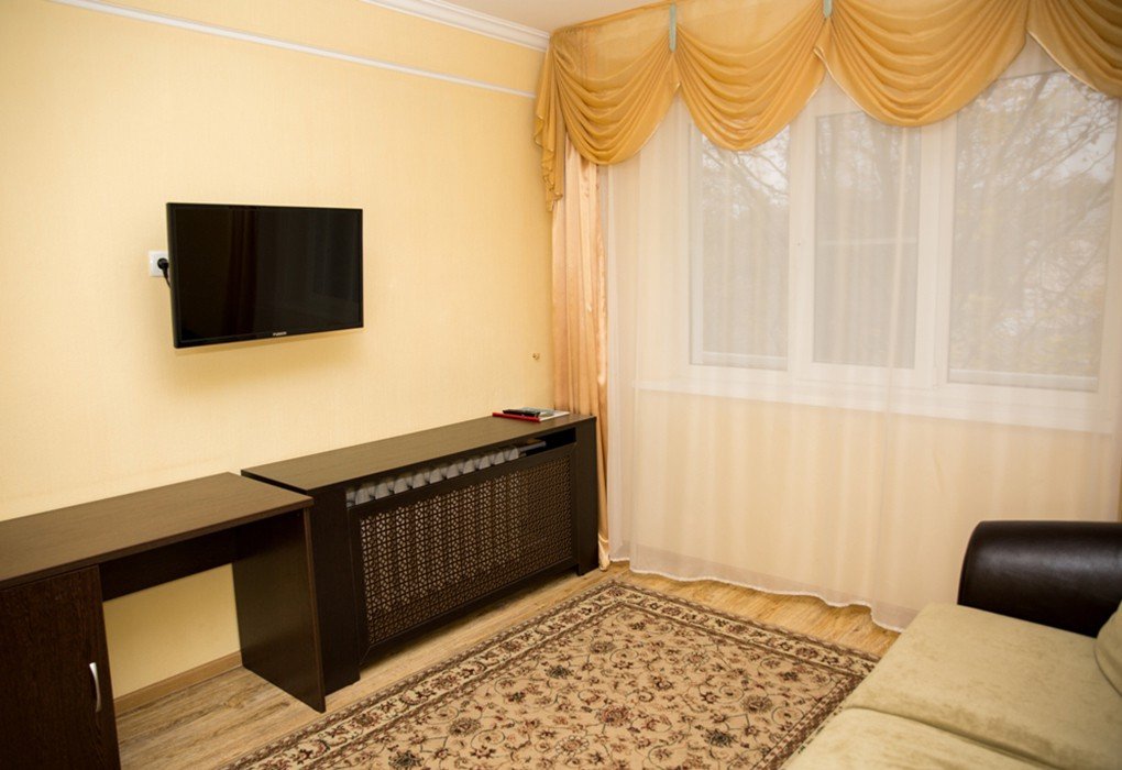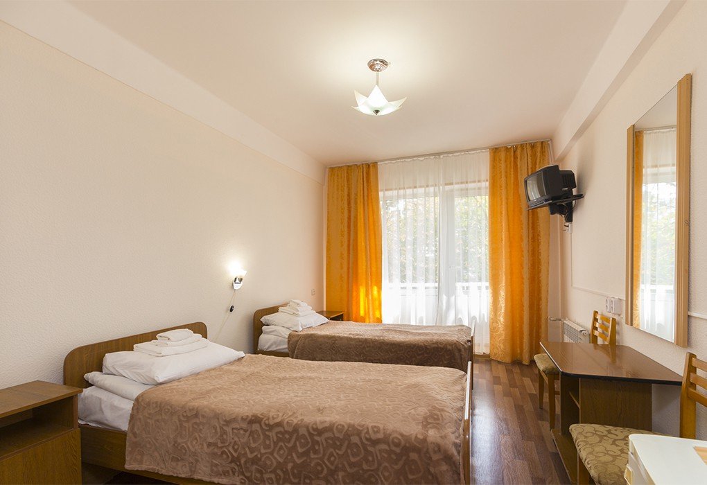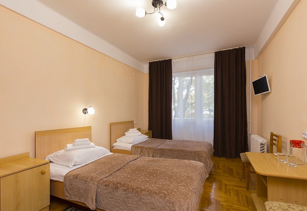 Короткий отпуск с друзьямиПланируем приехать сюда сноваМы проживали в пансионате с 14 по 21 мая. Пансионат расположен очень удачно, в центре города, рядом бювет с минеральной водой, парк "Цветник" (около него посадка в автобус на экскурсии). Мы покупали путевку без питания и с оздоровлением, поэтому про питание ничего сказать не могу, а оздоравливались мы только кислородным коктейлем и травяным чаем. Номер у нас был на 3 этаже, стандартный 2 категории. Номер вполне приличный, свежий ремонт, конечно это не евроремонт, но нам понравился: чисто и аккуратно. В комнате две кровати с удобными матрасами и подушками, новыми одеялами и чистым белым бельем. Для каждого гостя по 3 полотенца, их можно менять каждый день, постельное белье нам через 4 дня поменяли. В номере кондиционер, холодильник, чайник, фен. Все работает отлично. В коридоре стоит кулер. Также в номере большой балкон с сушилкой. В санузле сантехника простая, но новая и чистая, душ с занавеской. Вода холодная и горячая без перебоев, есть даже таз для стирки. Шампунь, гель для душа, мыло пополняют ежедневно. Уборка ежедневно. Персонал приветливый. Всем большое спасибо. В следующий раз планируем приехать полечиться.