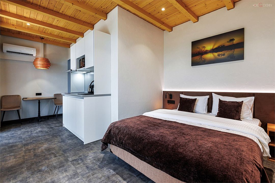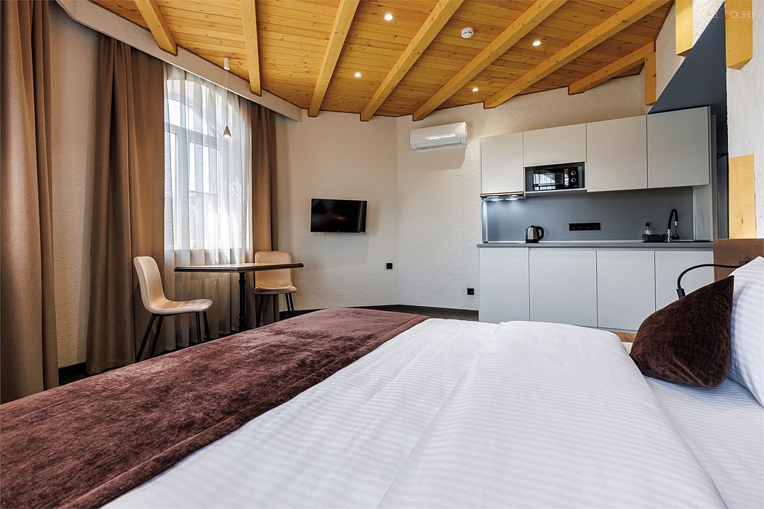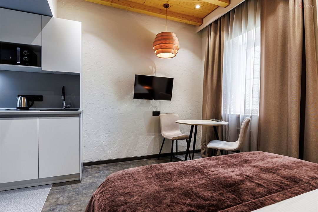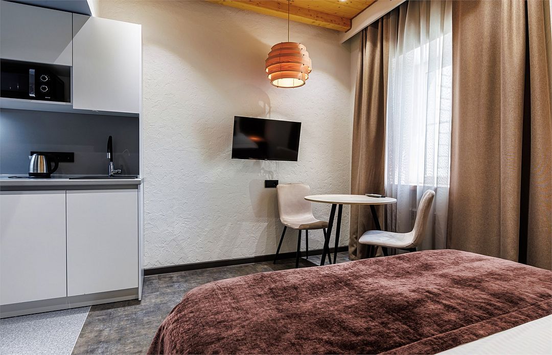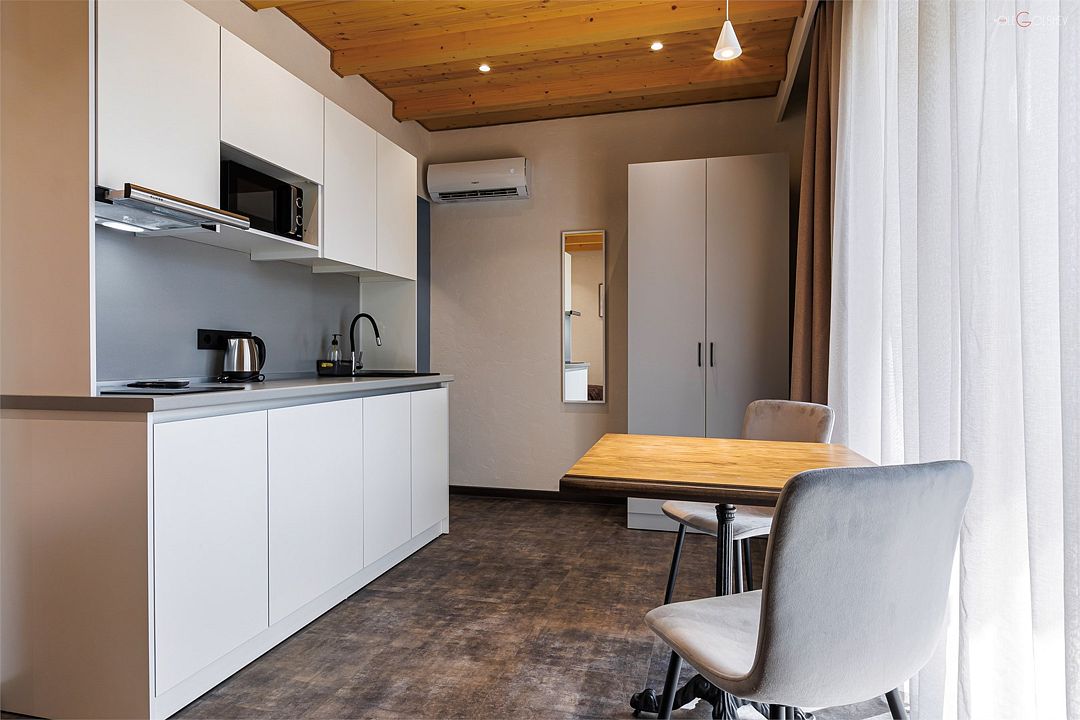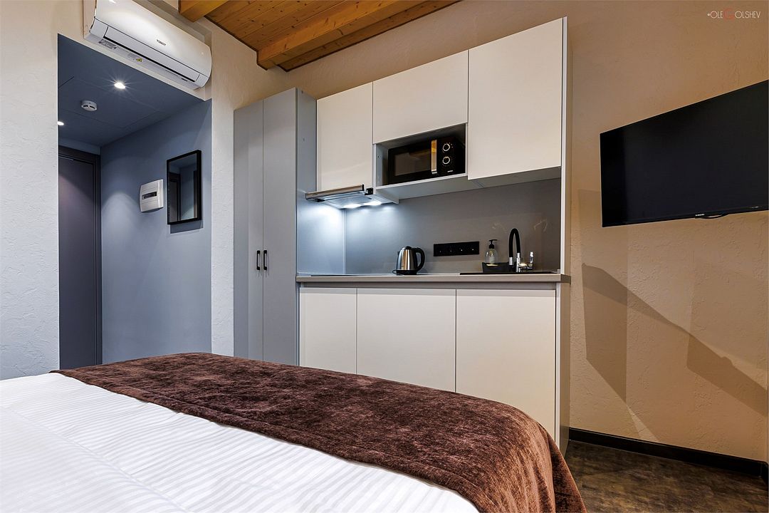 Апартаменты этой категории имеют двуспальную кровать размера Queen-size (160x200 см) с ортопедическим матрасом и мини-кухню, оснащенную плитой, холодильником и микроволновой печью. В каждом апартаменте имеется набор необходимой посуды. Ванная комната оборудована душевой кабиной. Во всех ванных комнатах есть фен, шампунь и гель для душа. Это самый компактный апартамент нашего Гостевого дома.