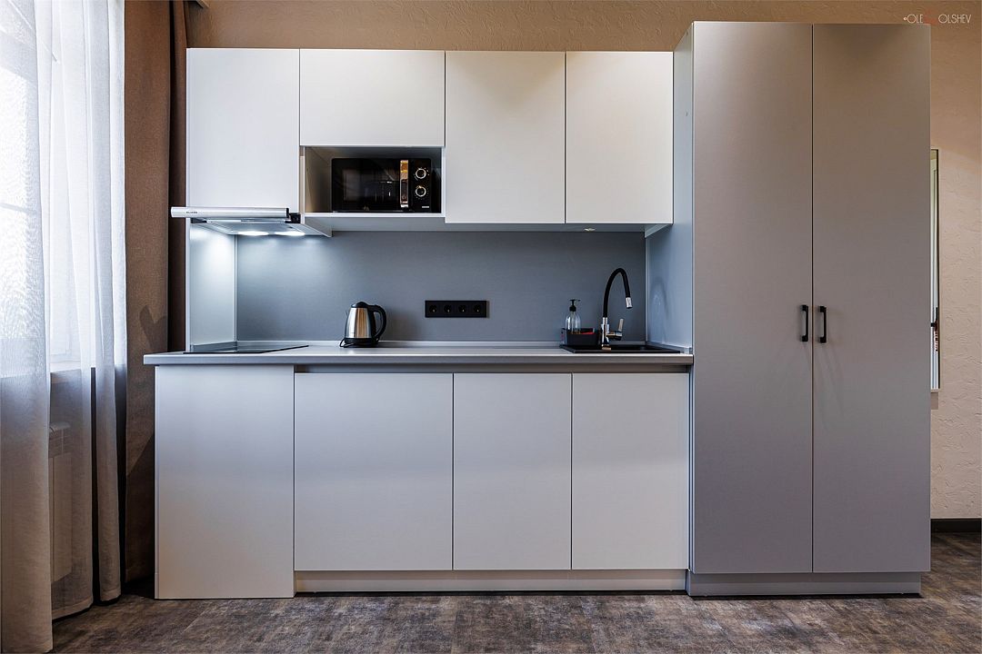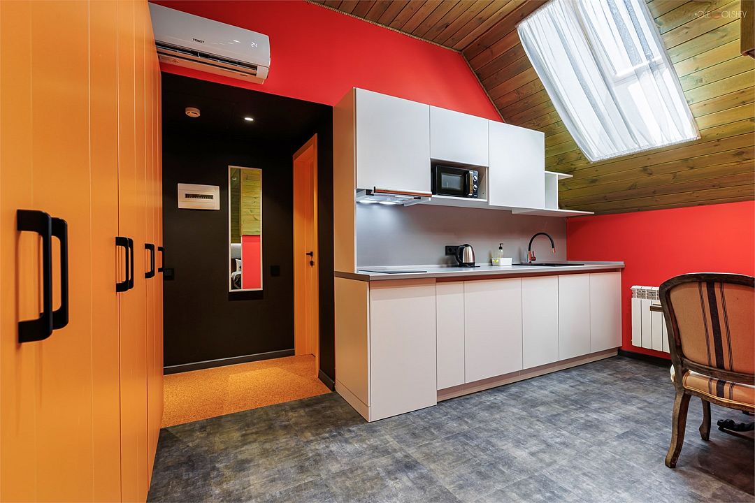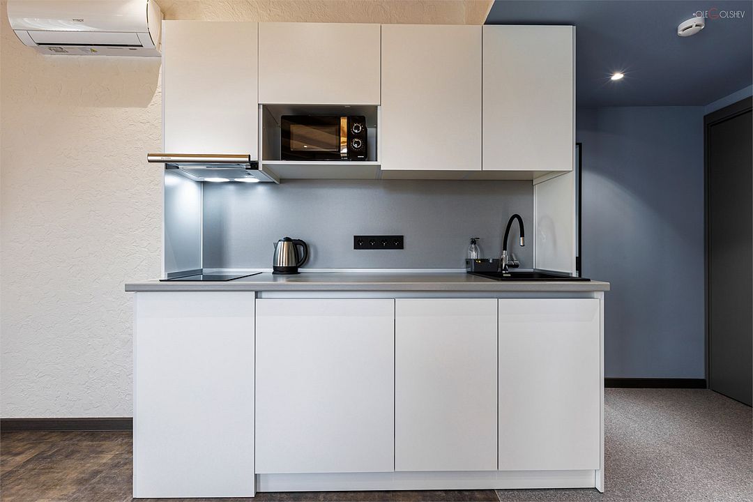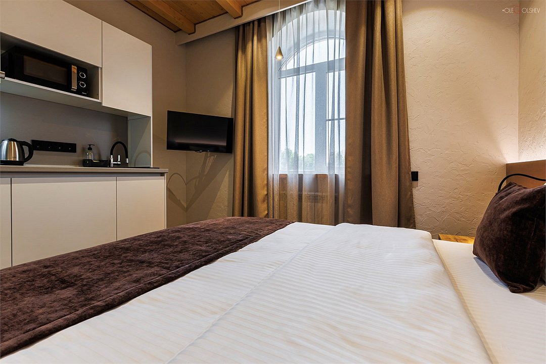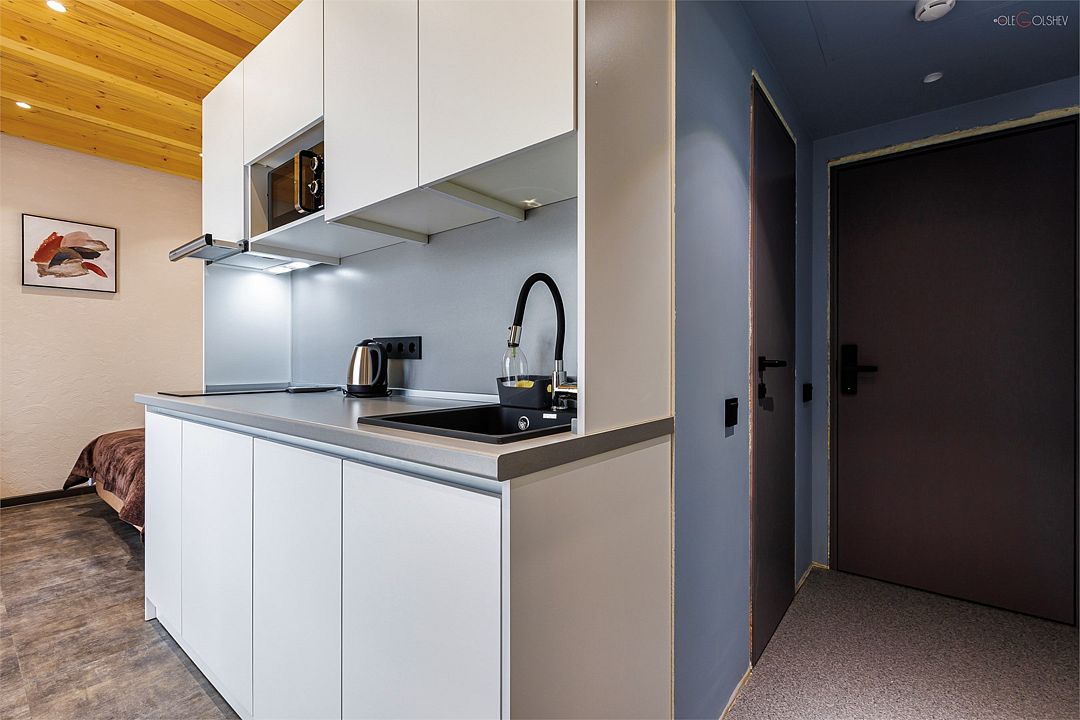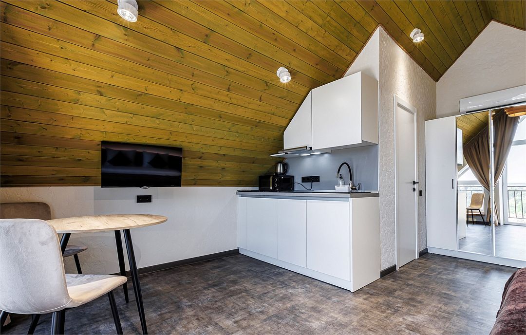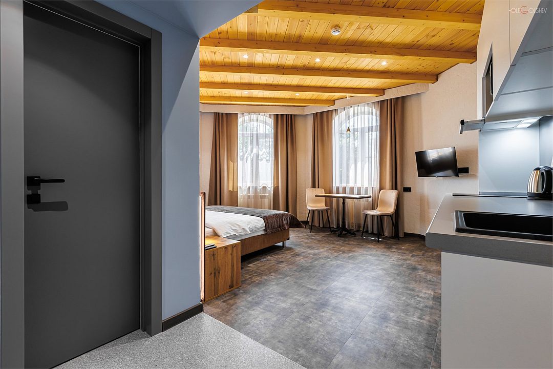 Апартаменты этой категории имеют двуспальную кровать размера Queen-size (160x200 см) с ортопедическим матрасом и мини-кухню, оснащенную плитой, холодильником и микроволновой печью. В каждом апартаменте имеется набор необходимой посуды. Ванная комната оборудована душевой кабиной. Во всех ванных комнатах есть фен, шампунь и гель для душа. Это самый компактный апартамент нашего Гостевого дома.