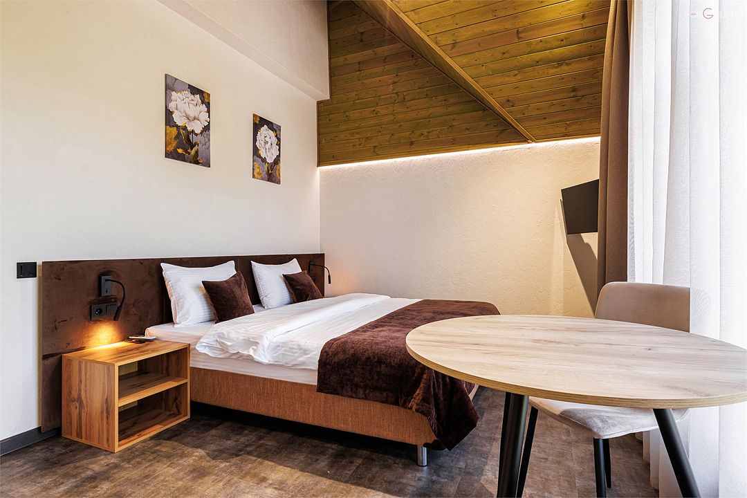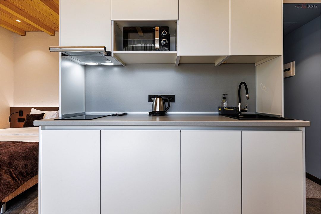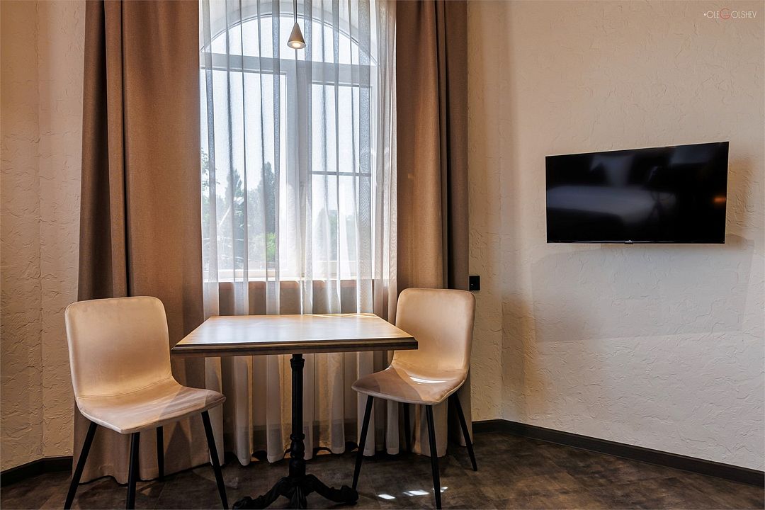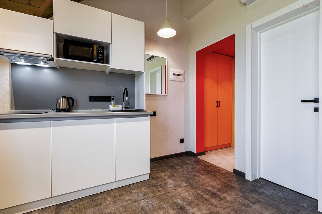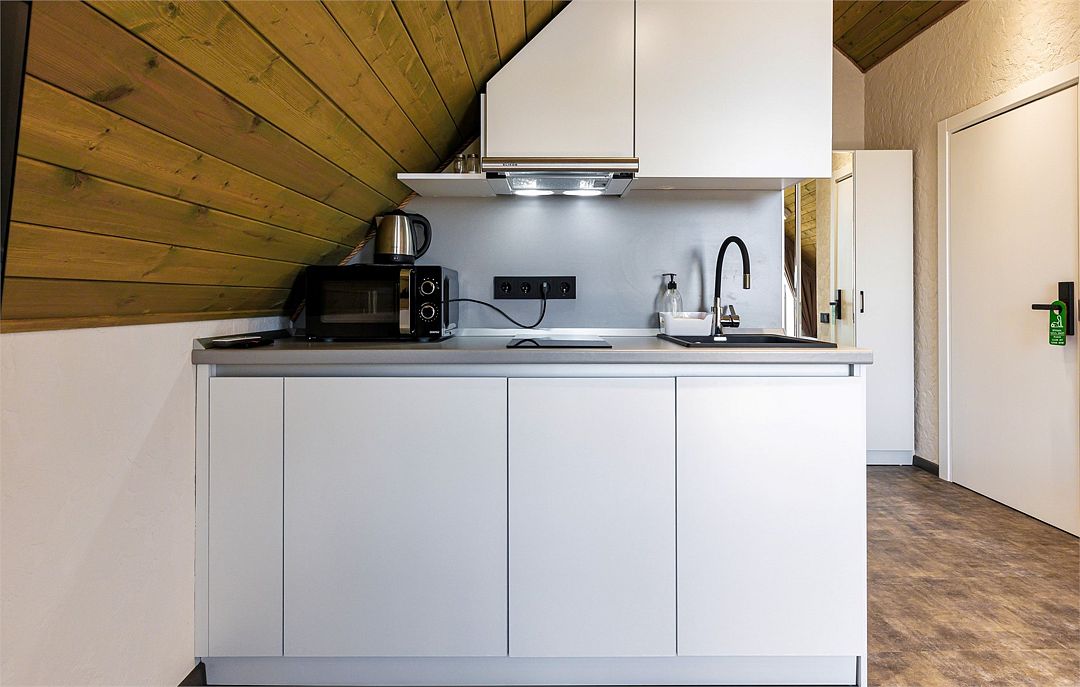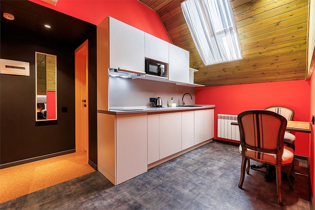 Апартаменты этой категории имеют двуспальную кровать размера Queen-size (160x200 см) с ортопедическим матрасом и мини-кухню, оснащенную плитой, холодильником и микроволновой печью. В каждом апартаменте имеется набор необходимой посуды. Ванная комната оборудована душевой кабиной. Во всех ванных комнатах есть фен, шампунь и гель для душа. Это самый компактный апартамент нашего Гостевого дома.