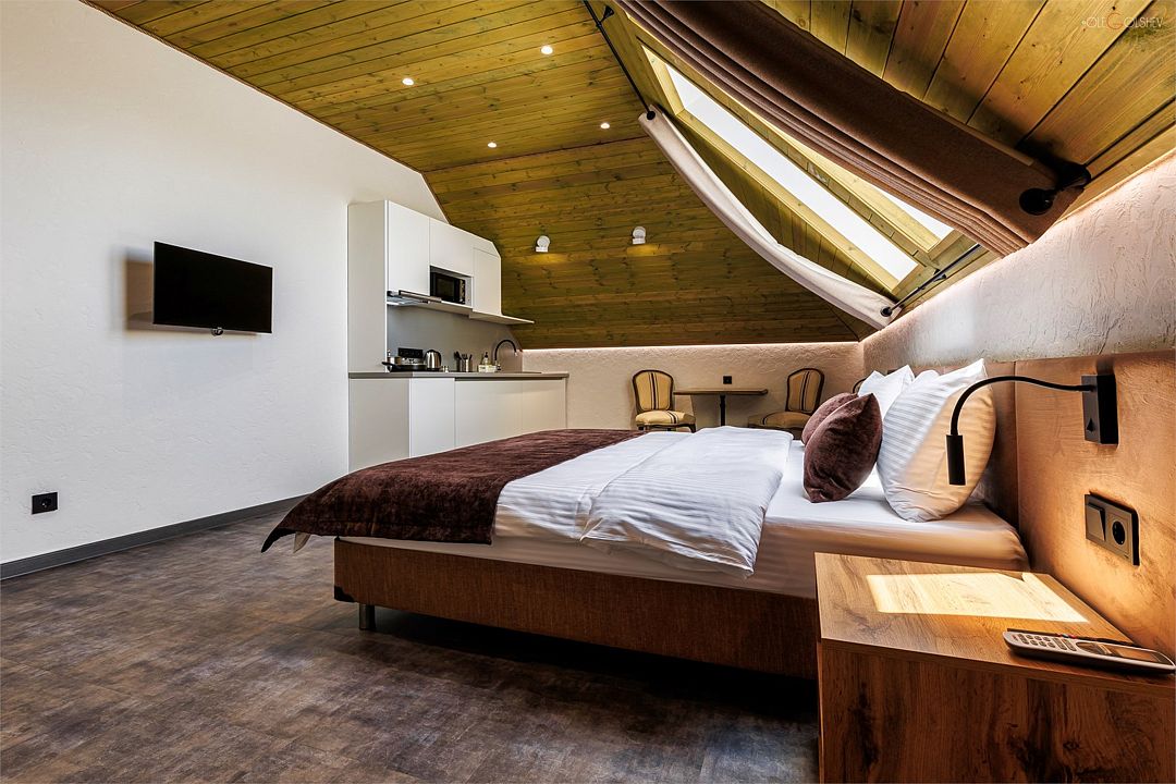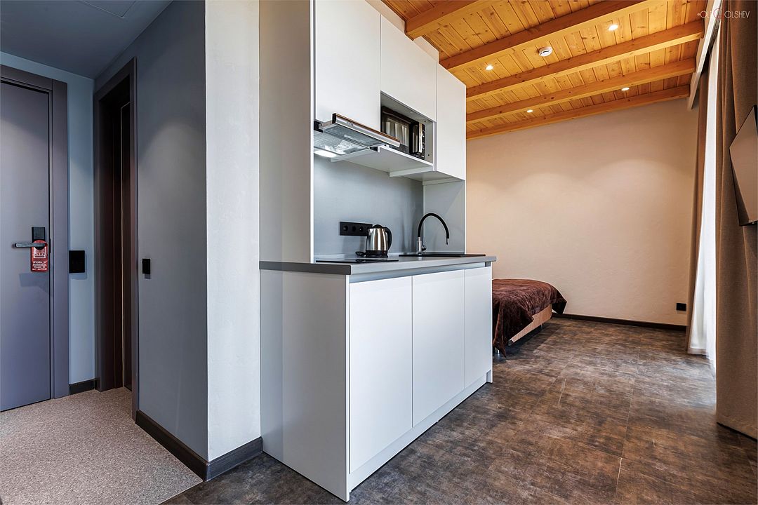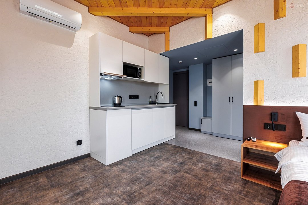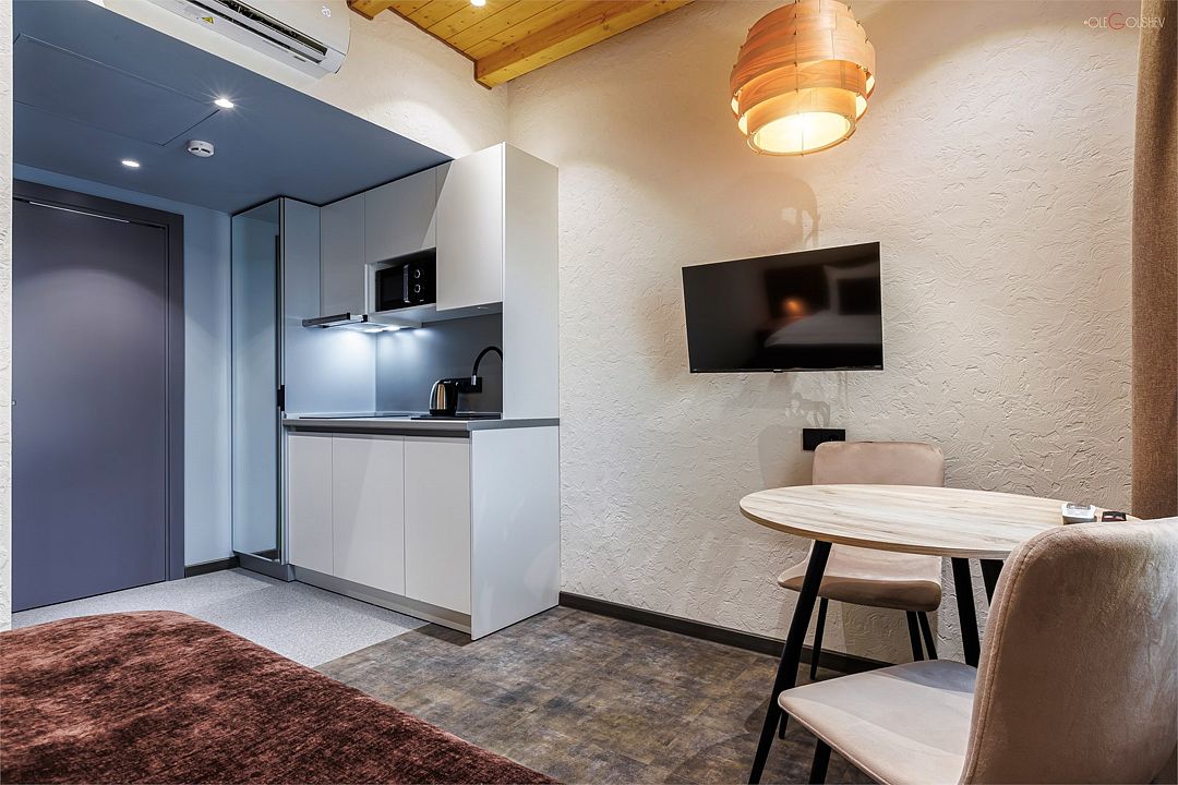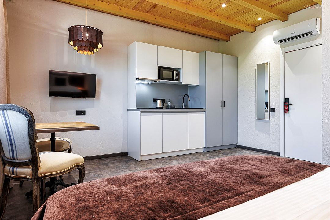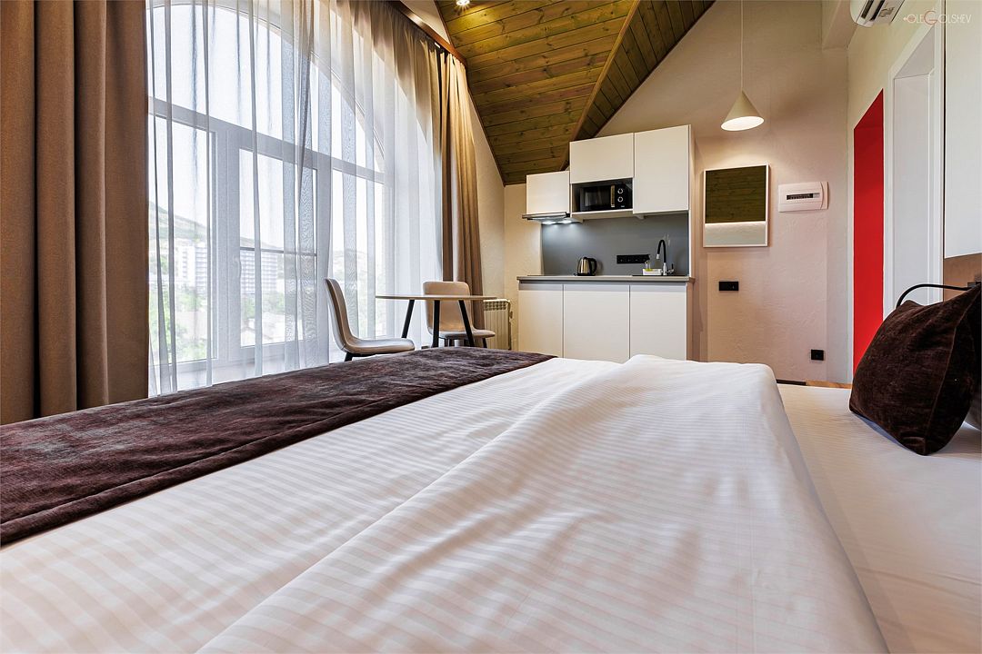 Апартаменты этой категории имеют двуспальную кровать размера Queen-size (160x200 см) с ортопедическим матрасом и мини-кухню, оснащенную плитой, холодильником и микроволновой печью. В каждом апартаменте имеется набор необходимой посуды. Ванная комната оборудована душевой кабиной. Во всех ванных комнатах есть фен, шампунь и гель для душа.