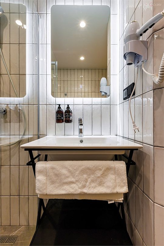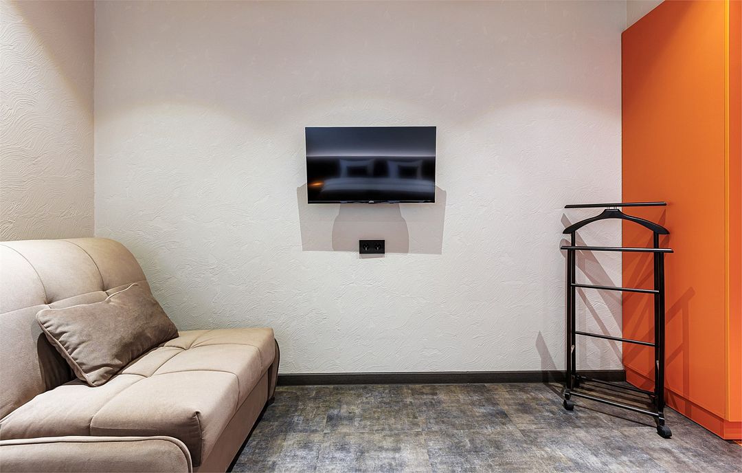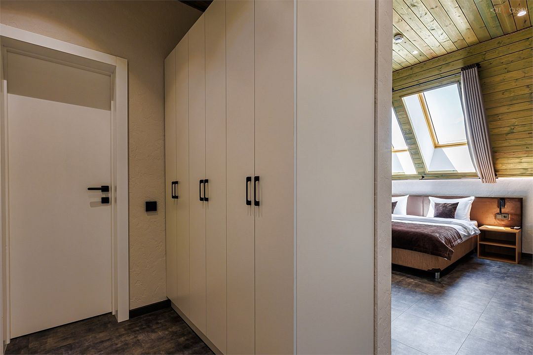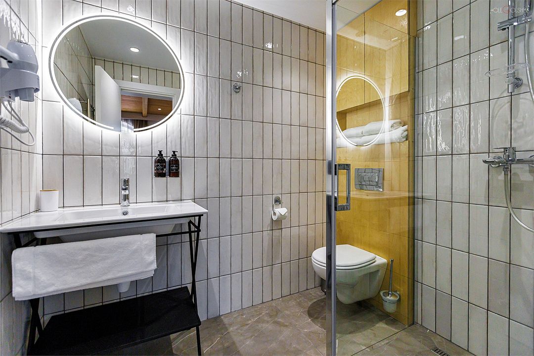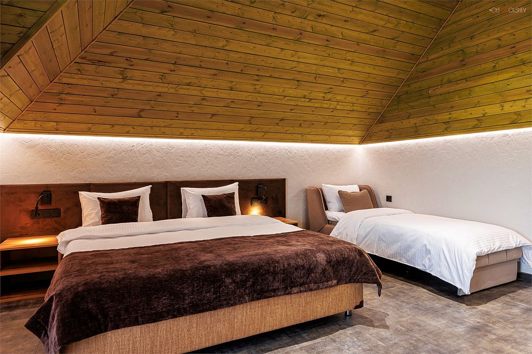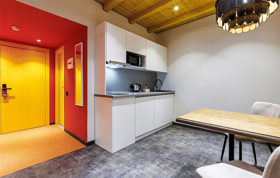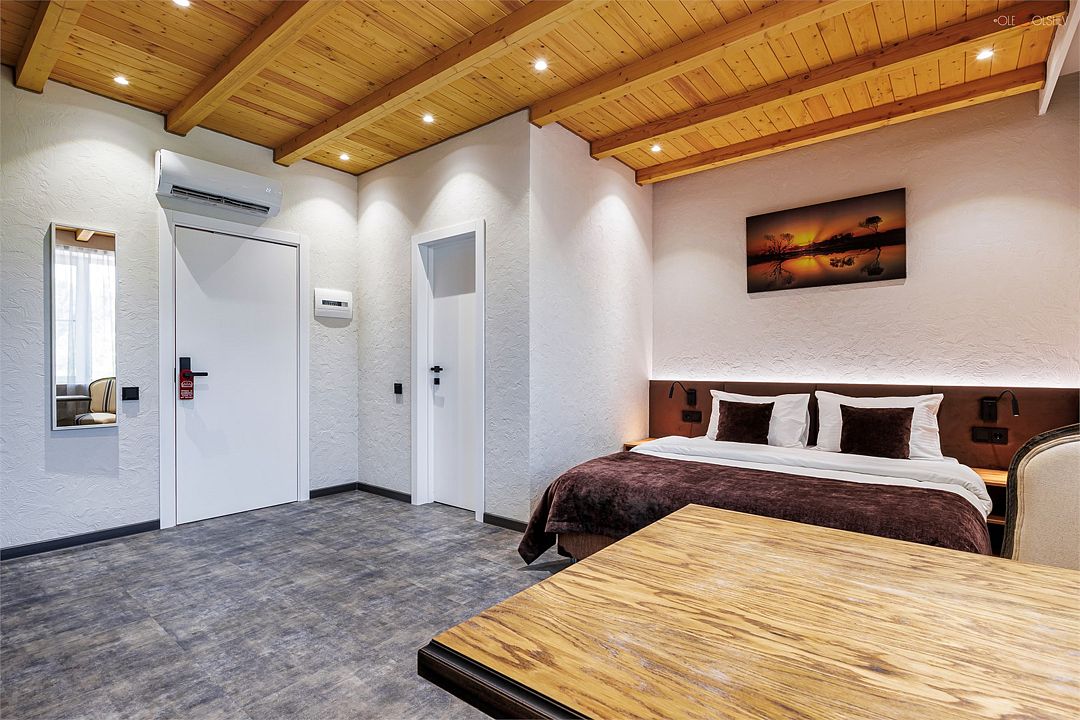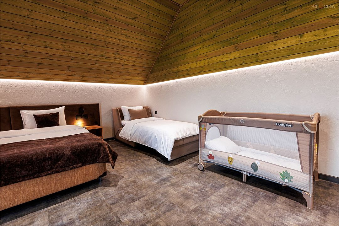 Помимо кровати размера queen-size (160x200 см) с ортопедическим матрасом, апартамент оснащен удобным креслом-кроватью. Семейные апартаменты улучшенной категории оборудованы плитой, холодильником и микроволновкой. В каждом номере имеется набор необходимой посуды. Ванная комната оснащена душевой кабиной. Во всех ванных комнатах есть фен, шампунь и гель для душа.