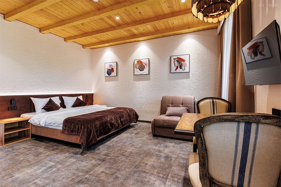 Апартамент разделен на гостиную и спальную зону, общая площадь составляет 38 кв.м. Помимо двуспальной кровати king-size (180*200 см) с ортопедическим матрасом, в апартамент есть удобное кресло-кровать. Семейный люкс оборудован плитой, холодильником, микроволновкой и набором необходимой посуды. Ванная комната оснащена душевой кабиной, а также феном, шампунем и гелем для душа.
