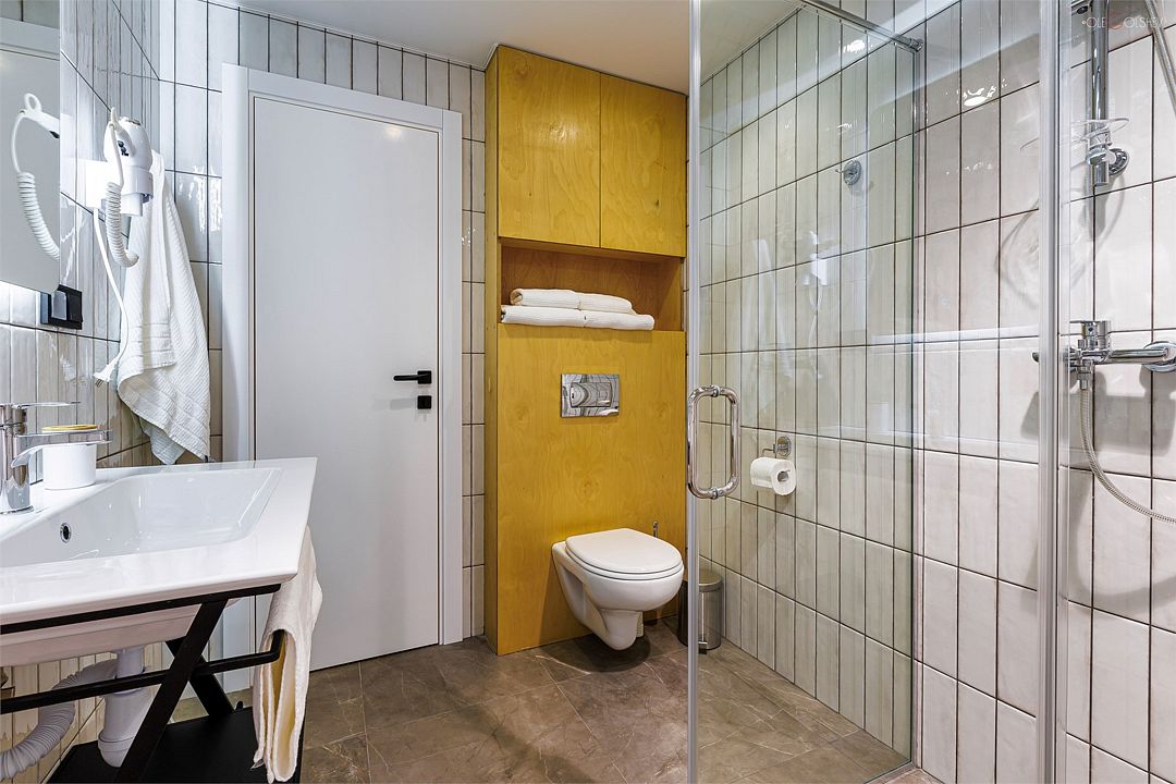 В апартаменте возможно размещение на кровати king-size (180*200 см) или на двух односпальных кроватях (90*200 см). Помимо этого апартамент оснащен удобным креслом-кроватью. Семейные апартаменты улучшенной категории оборудованы плитой, холодильником и микроволновкой. В каждом апартаменте имеется набор необходимой посуды. Ванная комната оснащена душевой кабиной. Во всех ванных комнатах есть фен, шампунь и гель для душа.