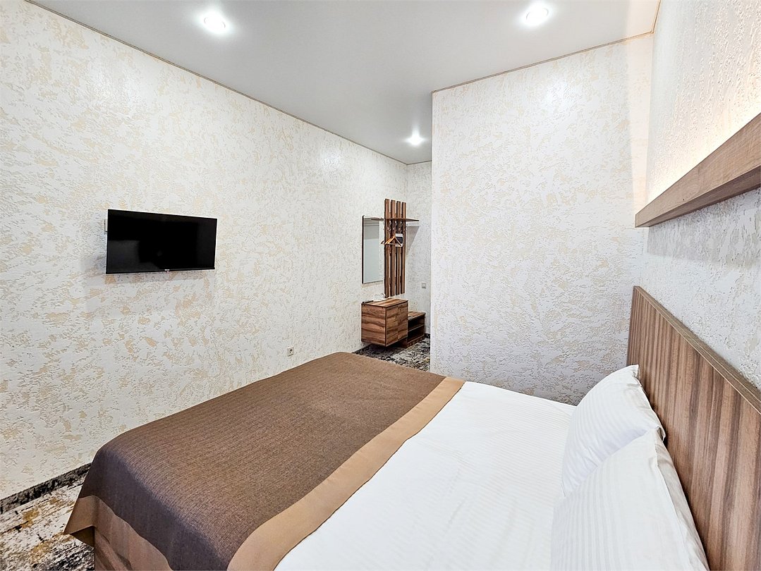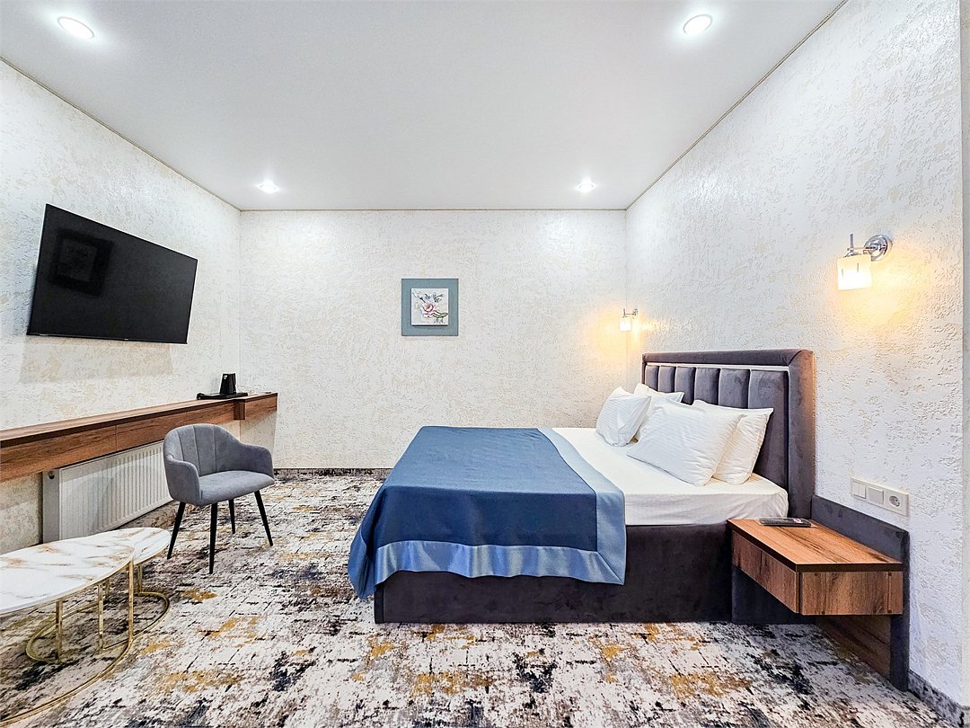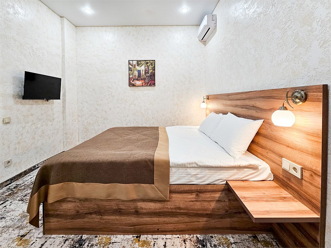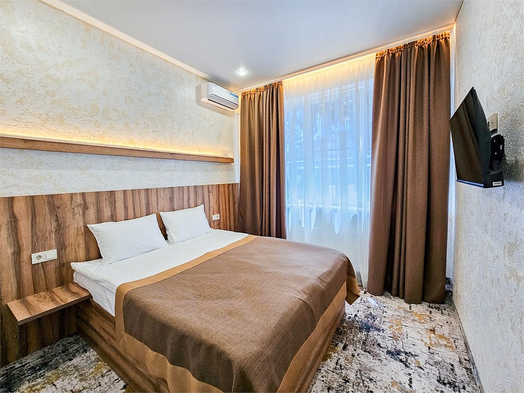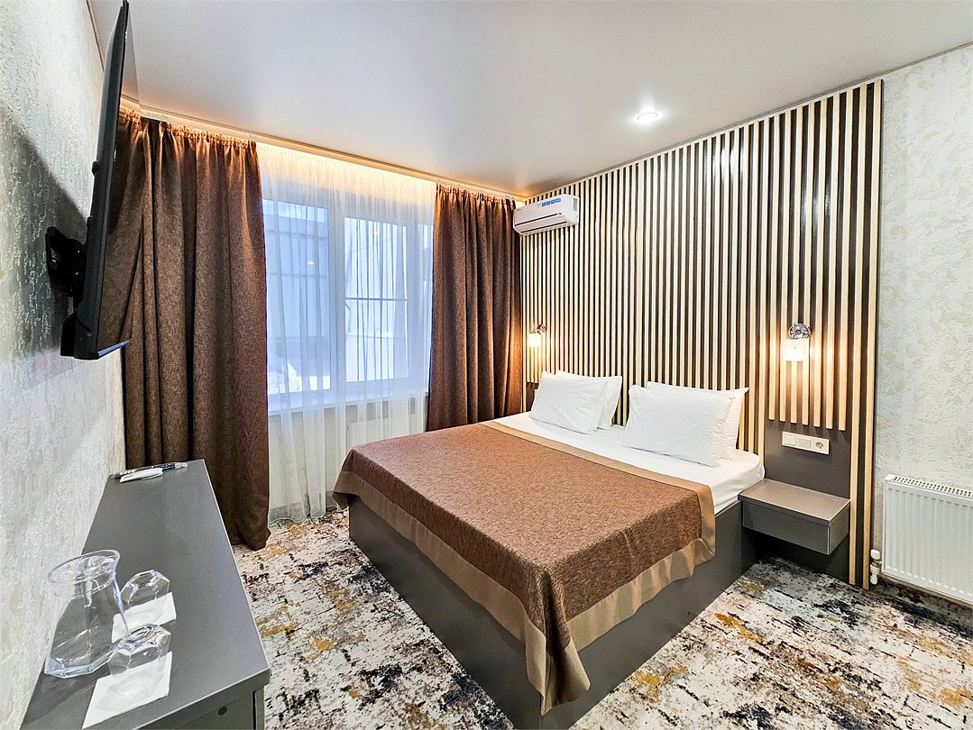 Wi-Fi, кондиционер, фен, душевая кабина, косметические средства, двуспальная кровать, шкаф для одежды, вешалки, зеркало, телевизор с плоским экраномВ гостиничном номере