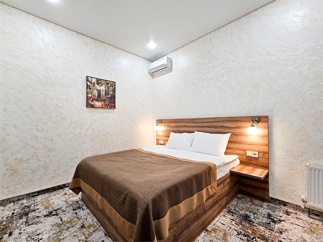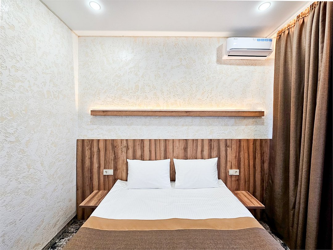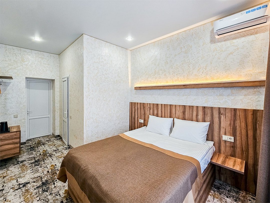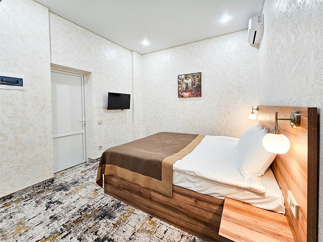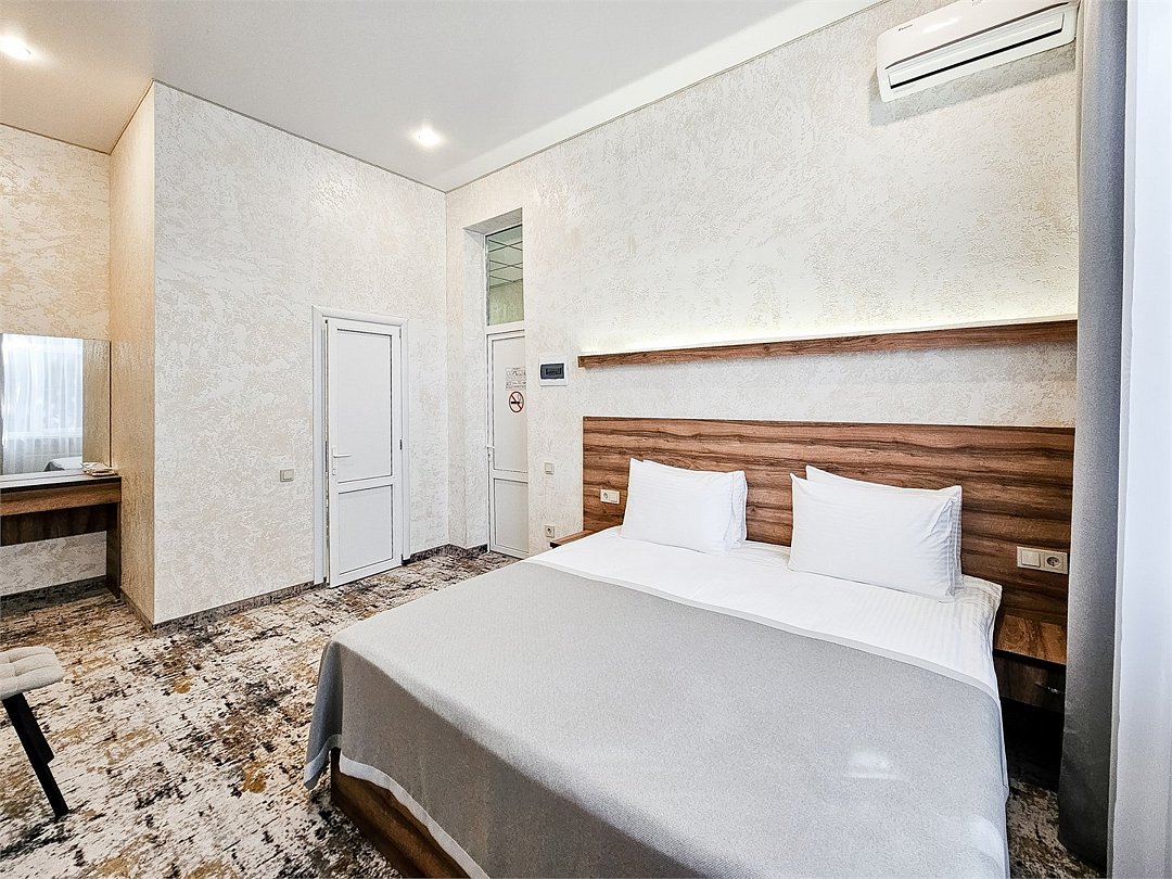 Wi-Fi, кондиционер, фен, душевая кабина, косметические средства, двуспальная кровать, шкаф для одежды, вешалки, зеркало, телевизор с плоским экраномВ гостиничном номере