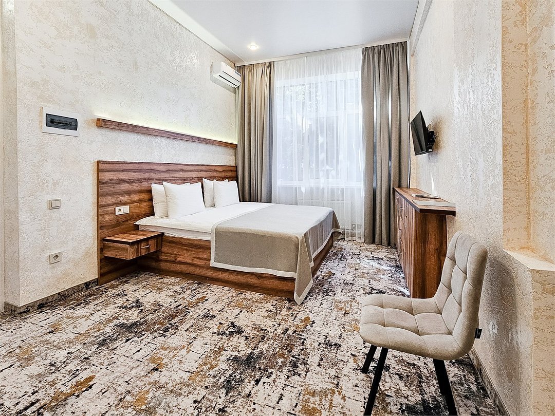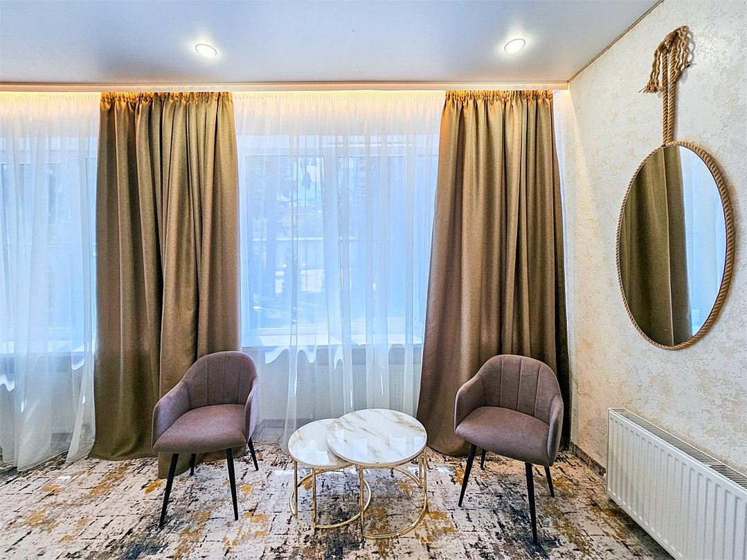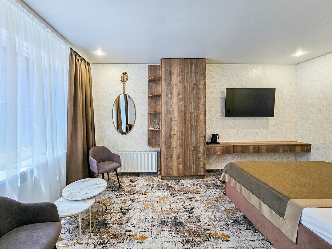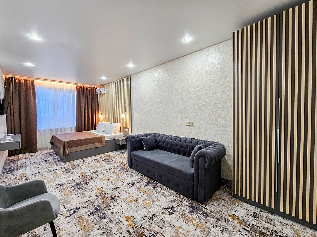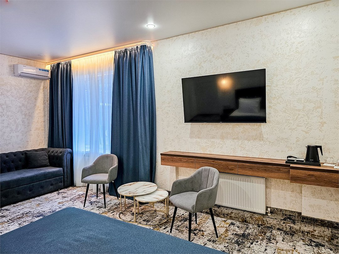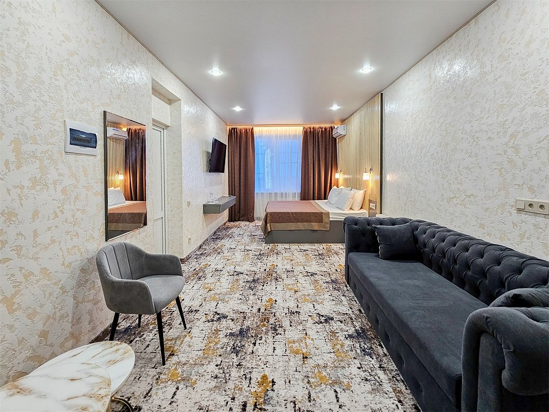 Номер категории LUX оснащен, двухспальная кровать, телевизор, кондиционер, шкаф, посуда, чайный набор, журнальный столик, раскладной диван, два стула, бра, халаты средства гигиены, комплект полотенец трех видов, душевая, санузел, фен, зеркало. Площадь номера 30 кв.Услуги и удобства