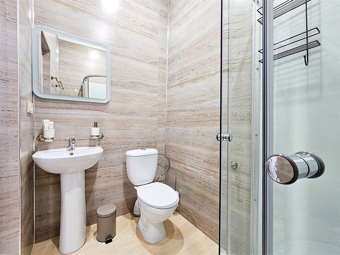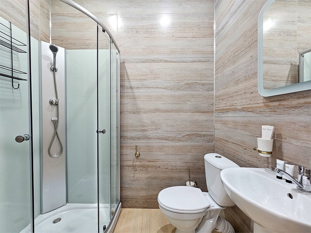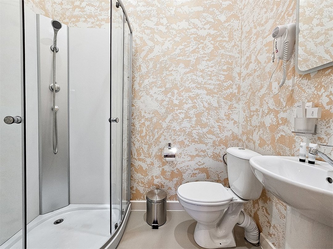спутниковое телевидение, Wi-Fi, светильник, фен, душевая кабина, халаты, банные полотенца, тапочки, гигиенические средства, двуспальная кровать, унитаз, туалетные средстваВ гостиничном номере