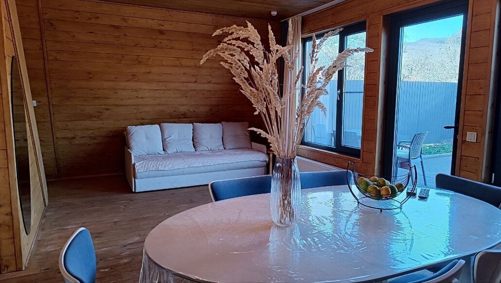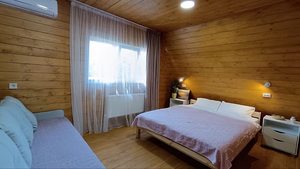 На первом этаже — спальня с двуспальной кроватью и диваном, кухня-гостиная с диваном и санузел с ванной. На втором этаже — спальня с двуспальной кроватью, в комнате — туалет и раковина. Гостиная с диваном и потрясающим видом на гору Бештау.