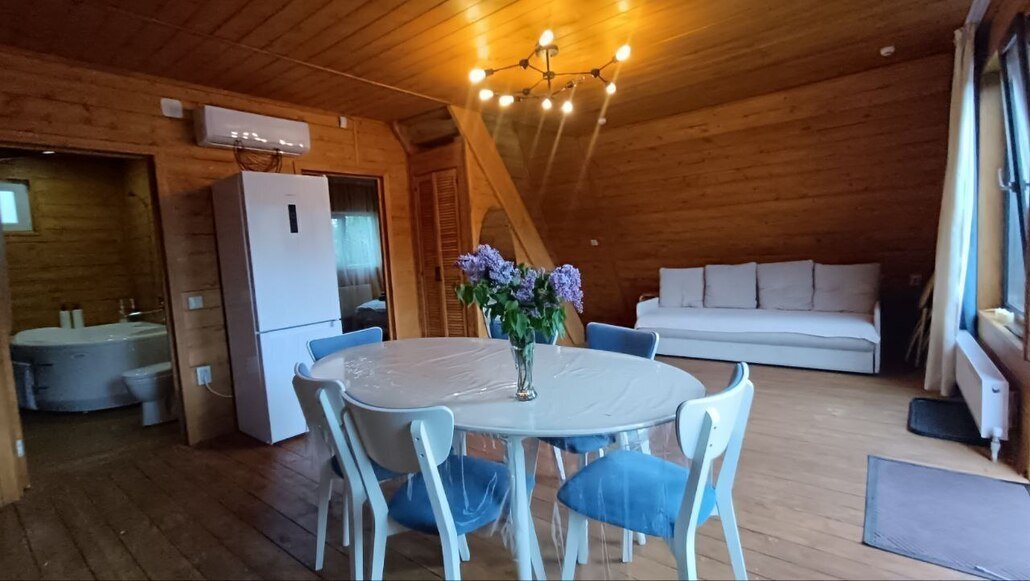 На мансардном этаже двуспальный матрас. Есть просторная терраса со стульчиками. Во дворе мангальная зона и уличный стол со скамейками. Имеются «дежурные» шампура, но лучше брать свои. Угли и дрова не предоставляем.