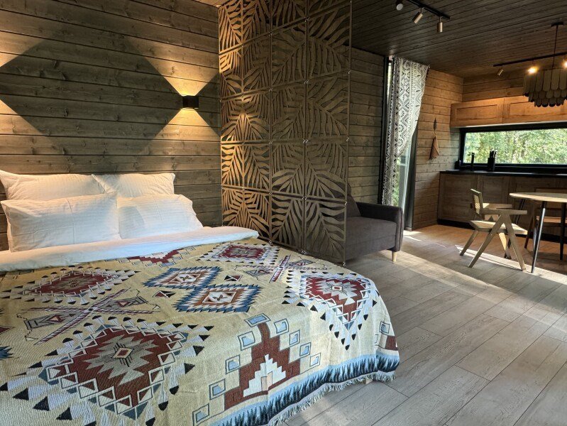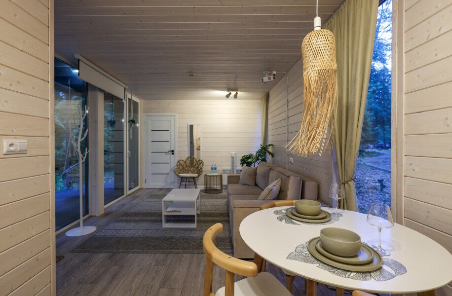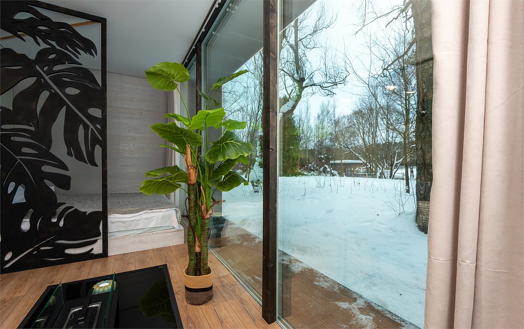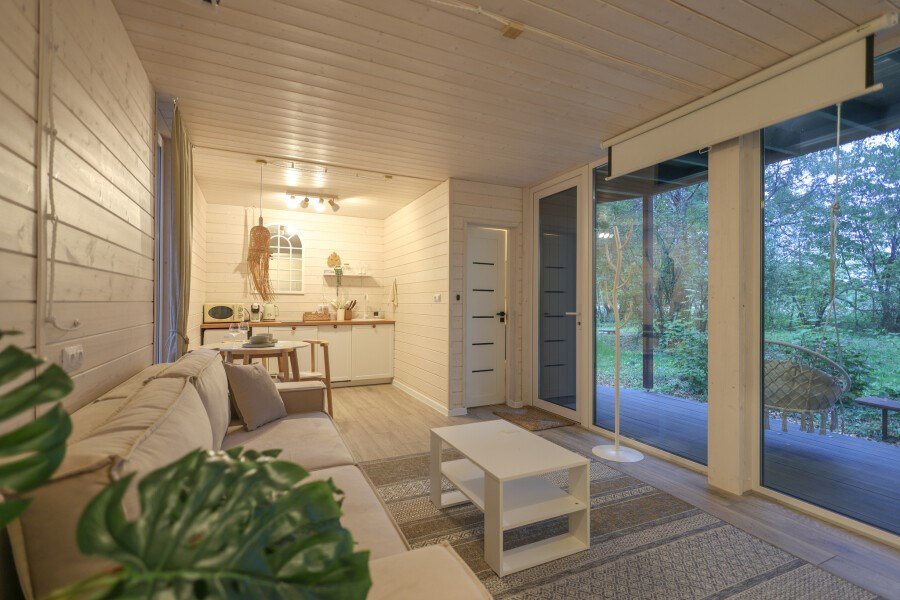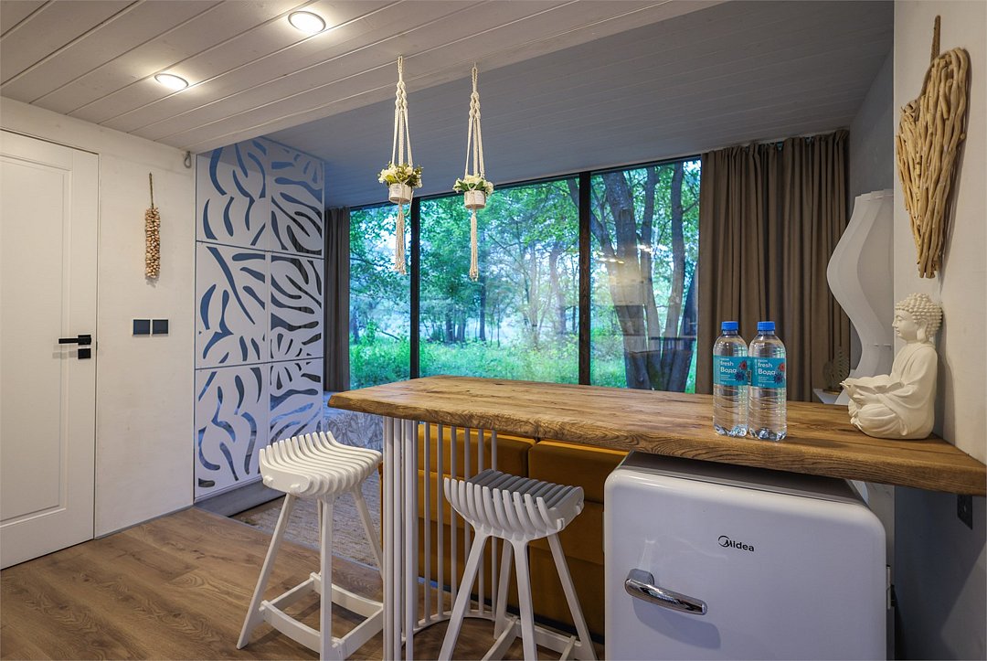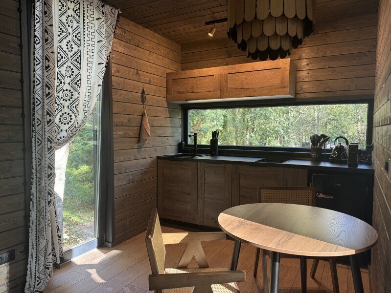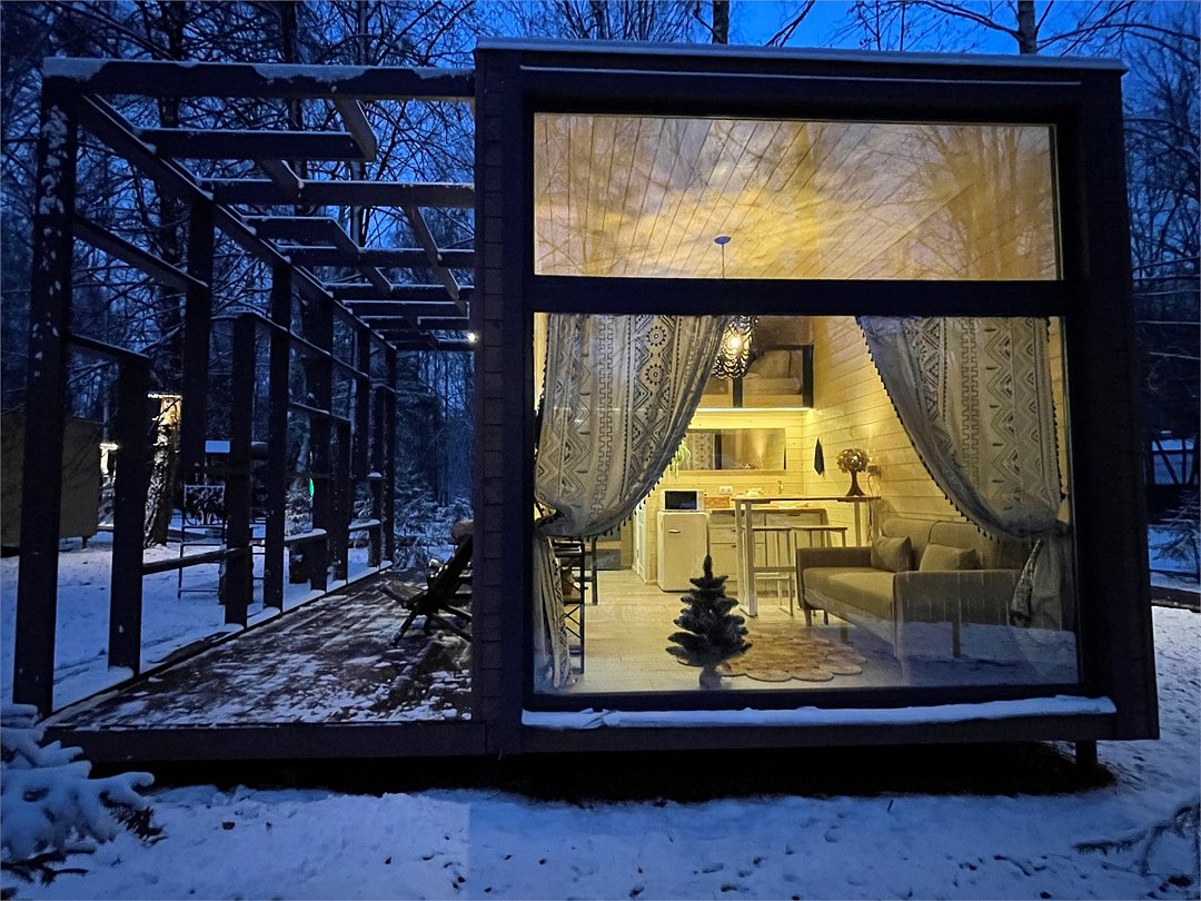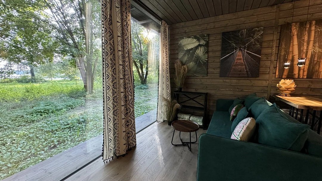 телевизор, Wi-Fi, фен, микроволновая печь, душевая кабина, санузел, гигиенические средства, двуспальная кровать, диван, шкаф для одежды, барная стойка, зеркало, унитаз, туалет, панорамные окна, раскладной диван, вид на лес, умная колонка, мыло, окна от пола до потолка, можно с питомцамиВ гостиничном номере
