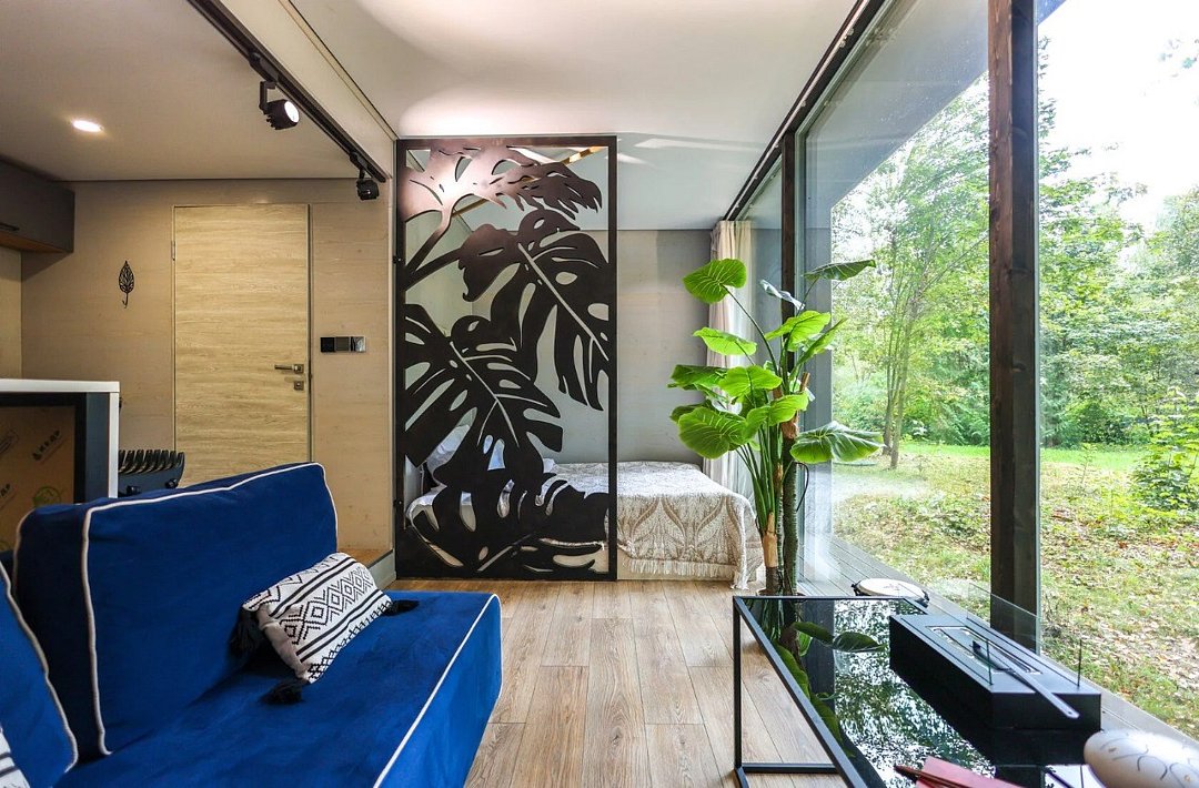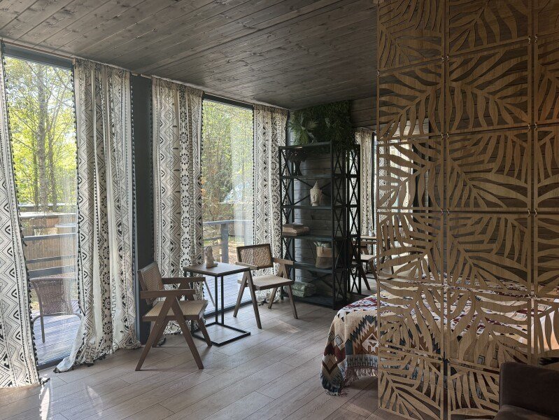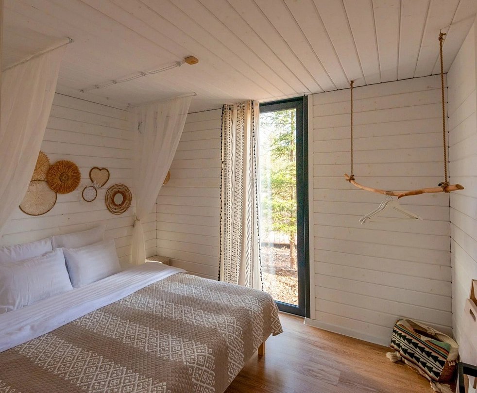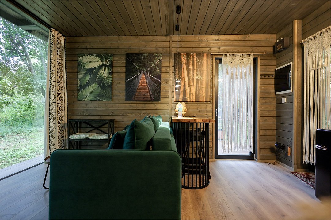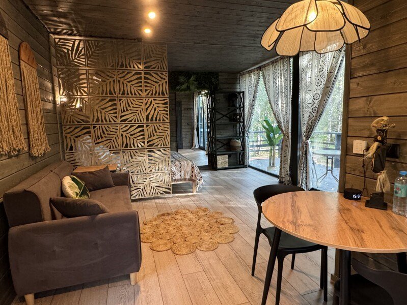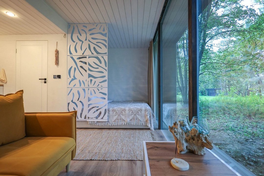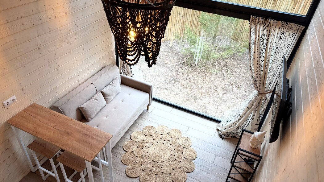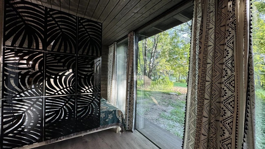 телевизор, Wi-Fi, фен, микроволновая печь, душевая кабина, санузел, гигиенические средства, двуспальная кровать, диван, шкаф для одежды, барная стойка, зеркало, унитаз, туалет, панорамные окна, раскладной диван, вид на лес, умная колонка, мыло, окна от пола до потолка, можно с питомцамиВ гостиничном номере