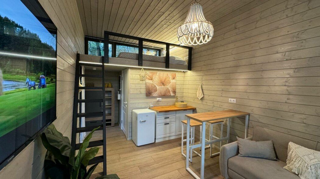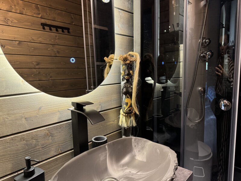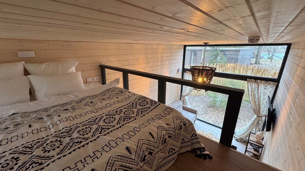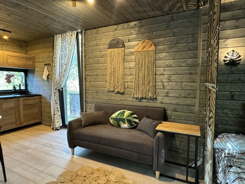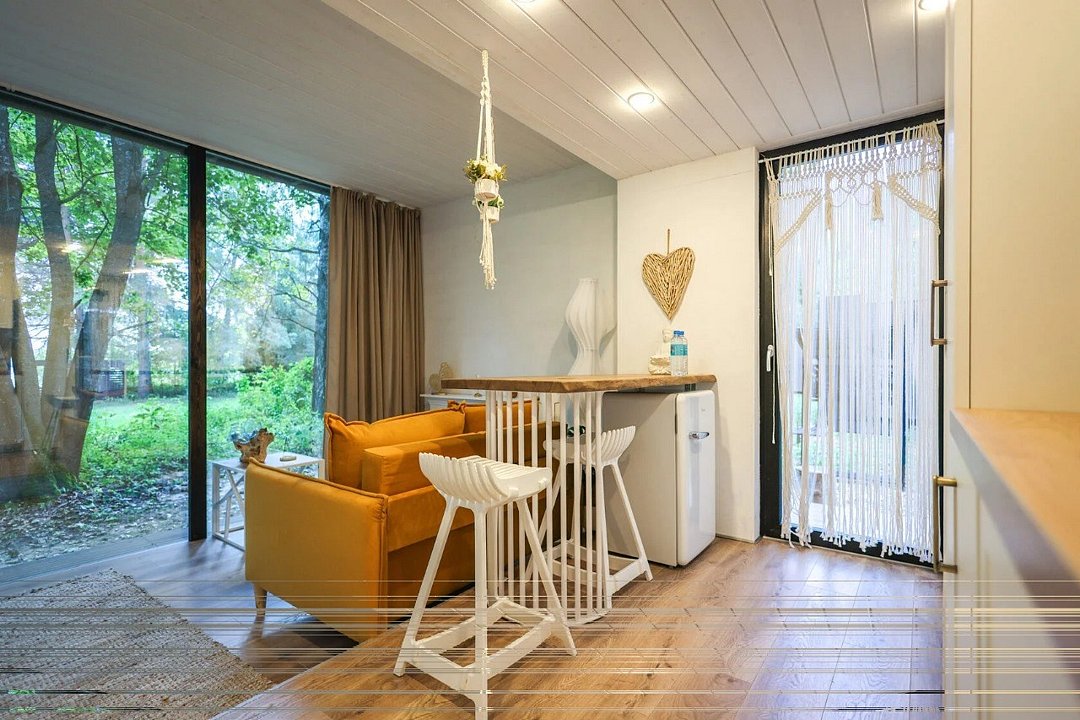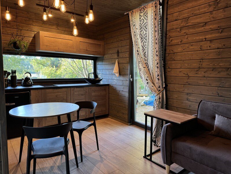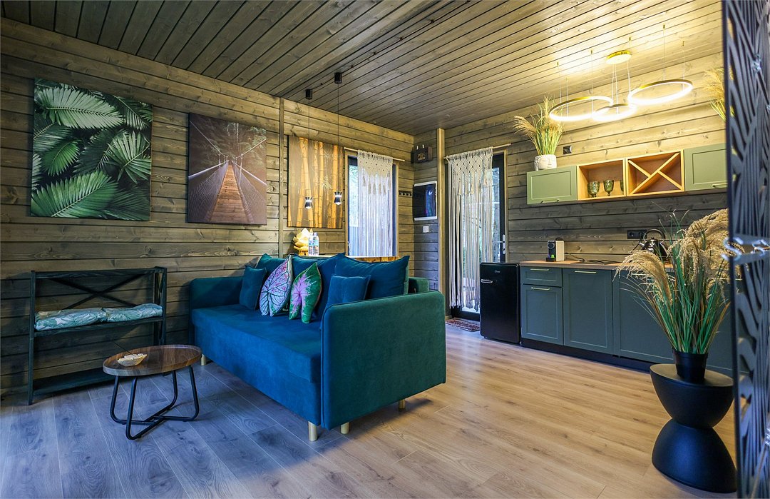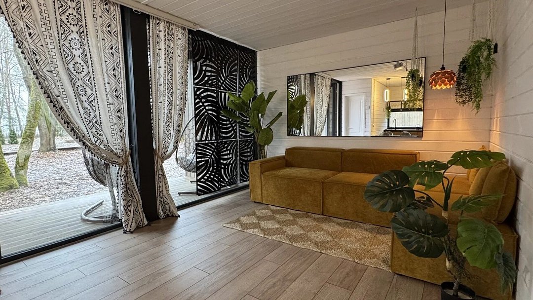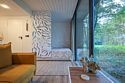 телевизор, Wi-Fi, фен, микроволновая печь, душевая кабина, санузел, гигиенические средства, двуспальная кровать, диван, шкаф для одежды, барная стойка, зеркало, унитаз, туалет, панорамные окна, раскладной диван, вид на лес, умная колонка, мыло, окна от пола до потолка, можно с питомцамиВ гостиничном номере
