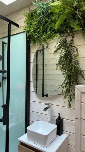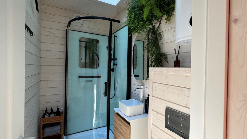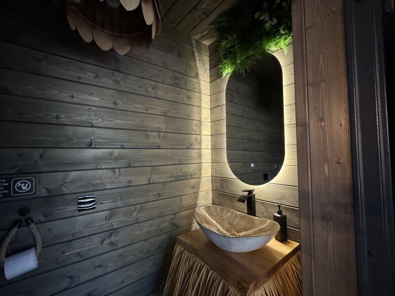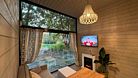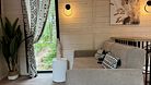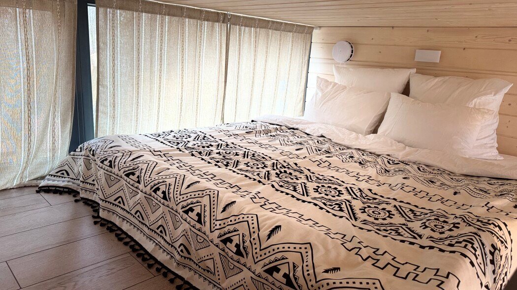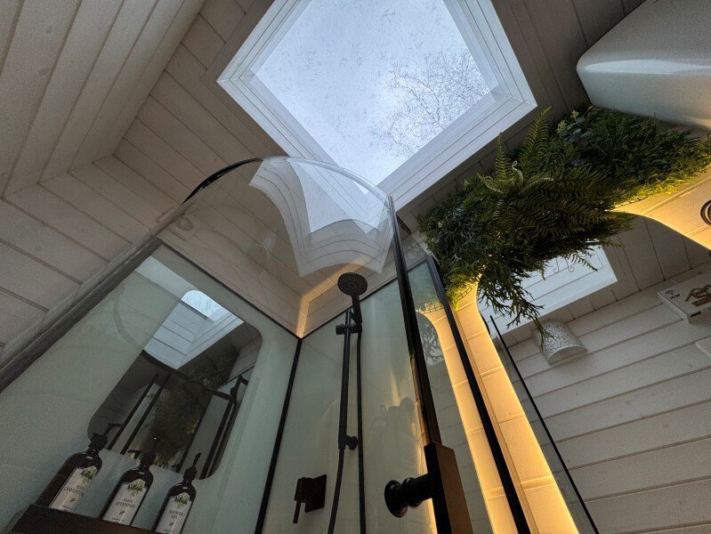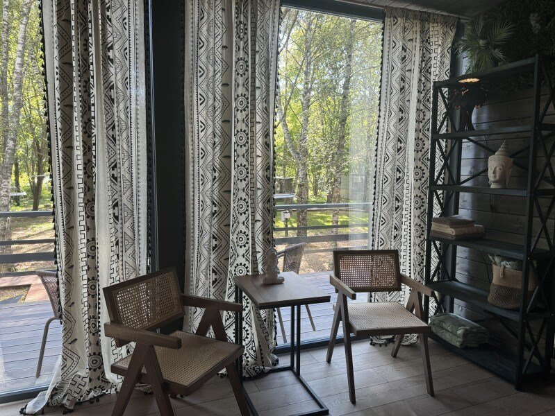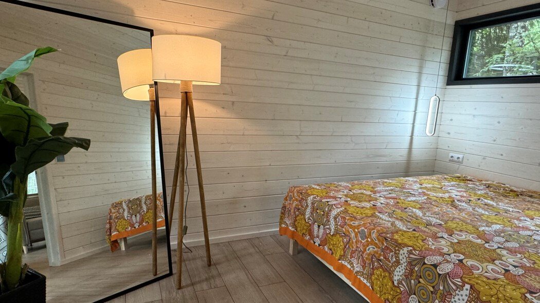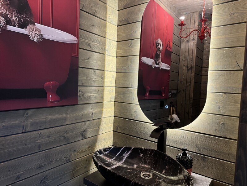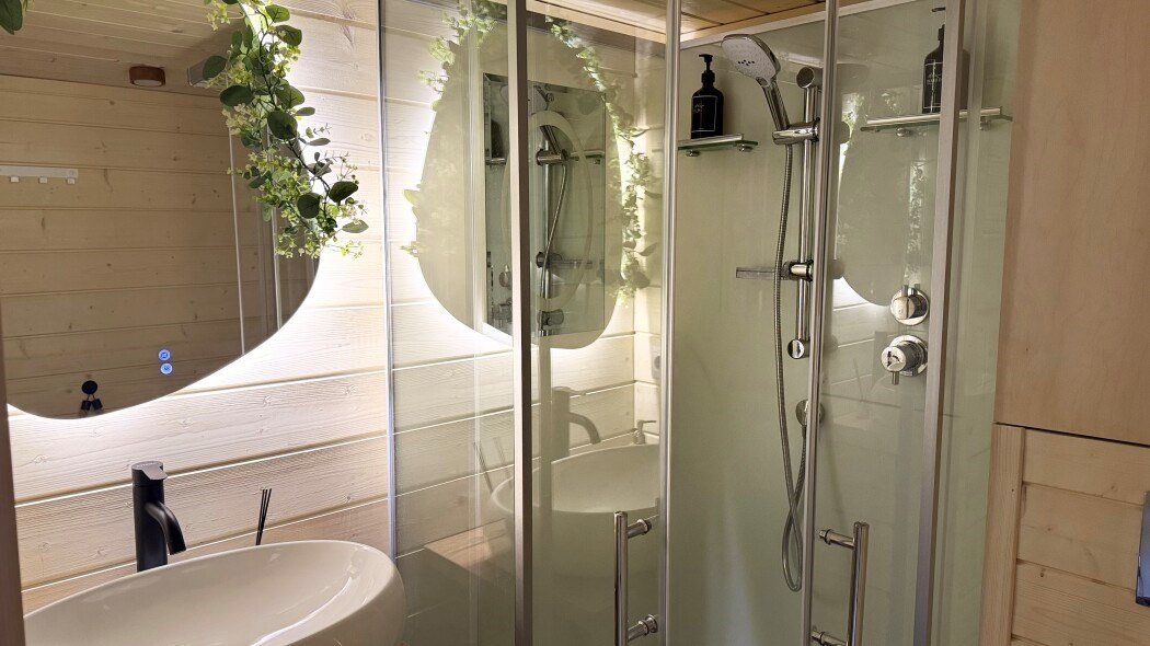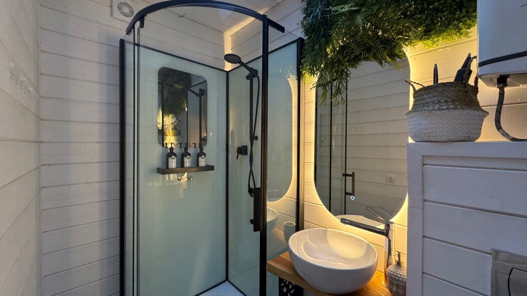 телевизор, Wi-Fi, фен, микроволновая печь, душевая кабина, санузел, гигиенические средства, двуспальная кровать, диван, шкаф для одежды, барная стойка, зеркало, унитаз, туалет, панорамные окна, раскладной диван, вид на лес, умная колонка, мыло, окна от пола до потолка, можно с питомцамиВ гостиничном номере