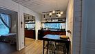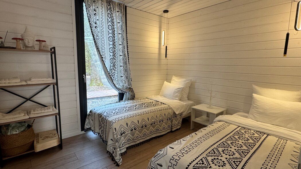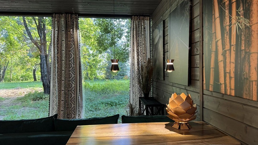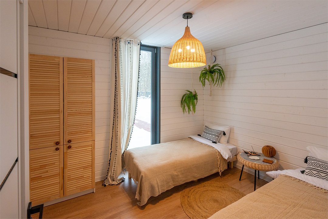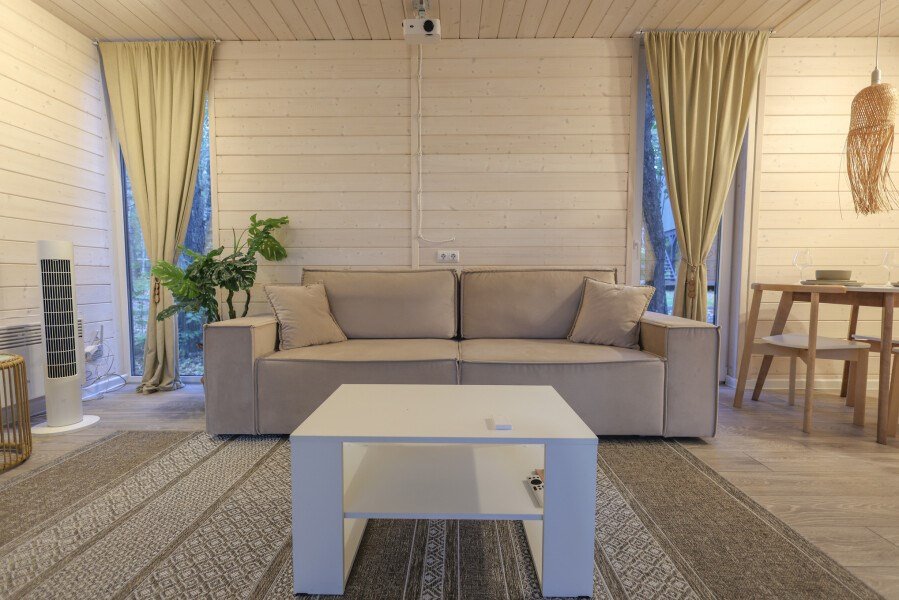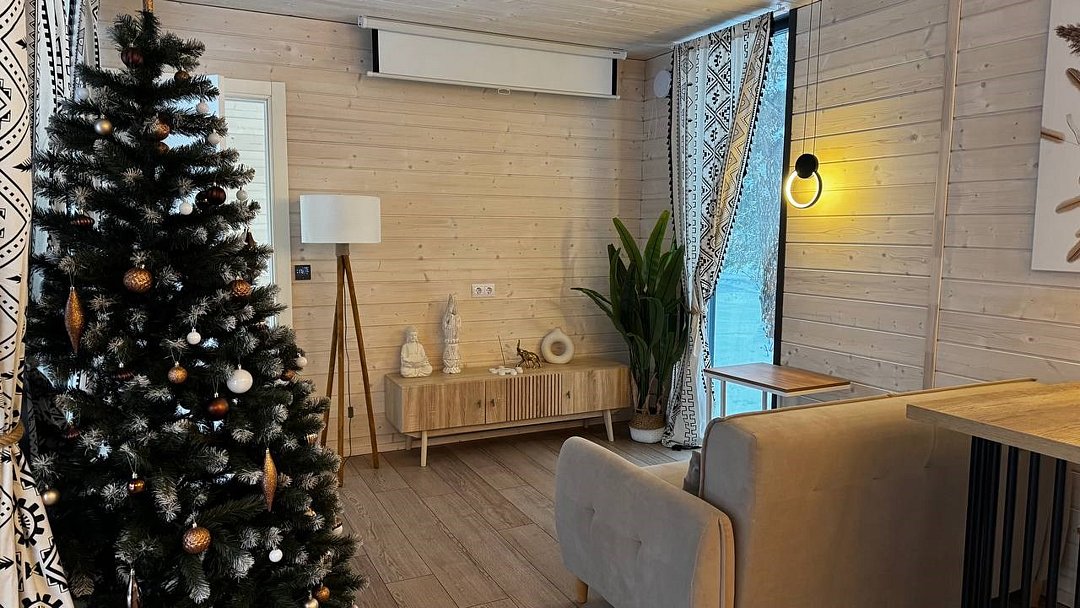 Большая вилла для компании с двумя спальнями и видом на водохранилище до 6 гостей - Просторная гостиная с удобным угловым диваном - Мангальная зона - Кухня со всей необходимой посудой и техникой - Терраса с уютным уголком для посиделок - проектор для просмотров фильмов в особой атмосфере - колонка Алиса и система "умный дом" - горячий чан (по запросу) Спальня 1 - Двуспальная кровать Спальня 2 - Две односпальные кровати, которые можно сдвинуть в однуУслуги и удобства