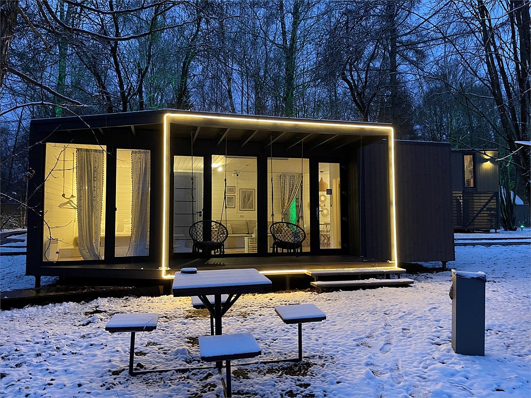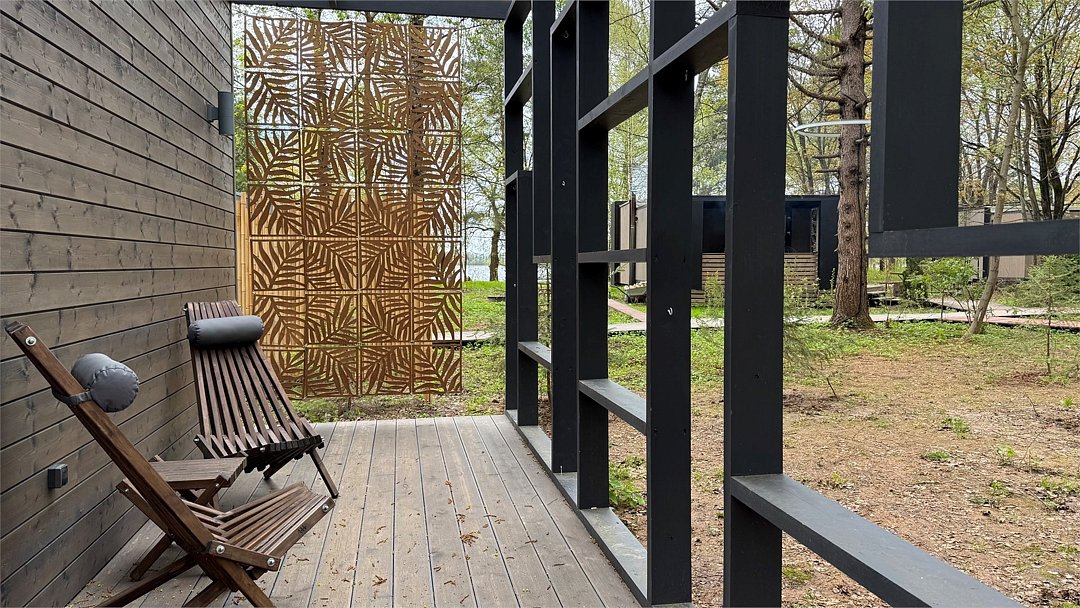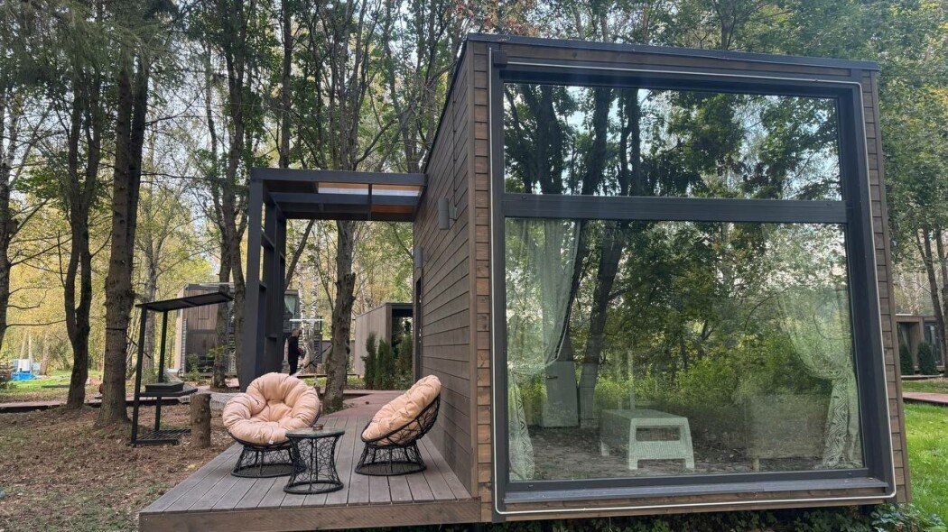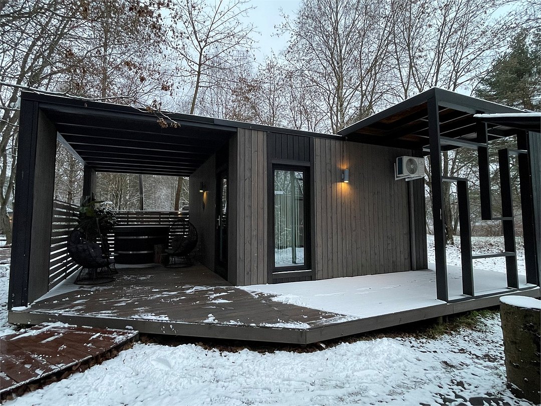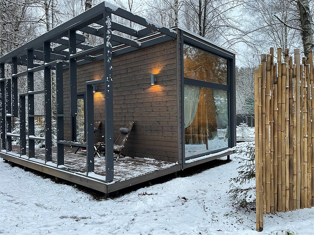 Wi-Fi, фен, микроволновая печь, душевая кабина, косметические средства, терраса, кровать «Queen size», две односпальные кровати, кухня, посудомоечная машина, кухонная посуда, мангал, панорамные окна, мини-холодильник, вид на озеро, вид на лес, общественный бассейн, система умный дом, проектор, угловой диван-кровать, умная колонка, без питомцевВ коттедже