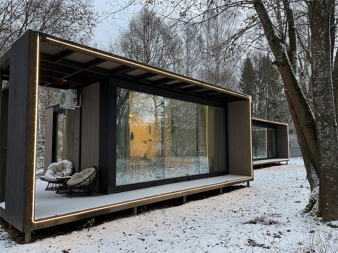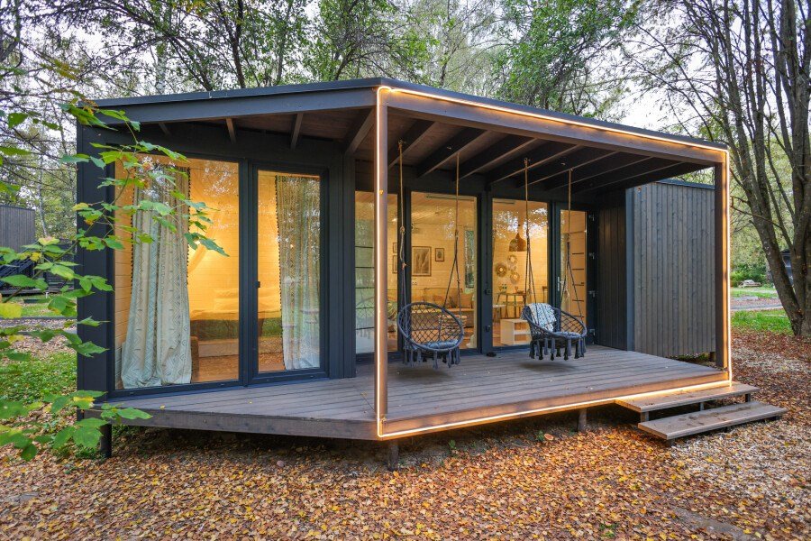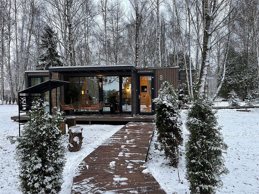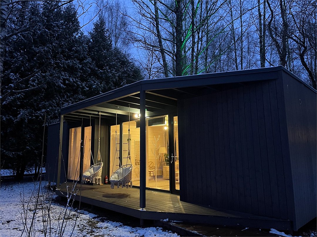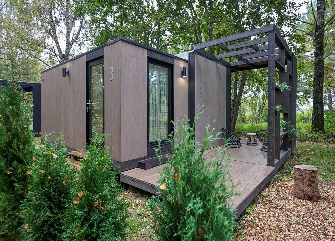Wi-Fi, фен, микроволновая печь, душевая кабина, косметические средства, терраса, кровать «Queen size», две односпальные кровати, кухня, посудомоечная машина, кухонная посуда, мангал, панорамные окна, мини-холодильник, вид на озеро, вид на лес, общественный бассейн, система умный дом, проектор, угловой диван-кровать, умная колонка, без питомцевВ коттедже