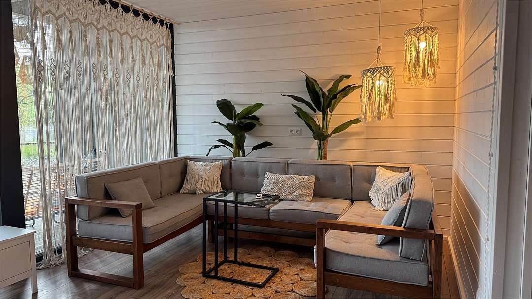 Большая вилла для компании с двумя спальнями и видом на водохранилище до 6 гостей - Просторная гостиная с удобным угловым диваном - Мангальная зона - Кухня со всей необходимой посудой и техникой - Терраса с уютным уголком для посиделок Спальня 1 - Двуспальная кровать Спальня 2 - Две односпальные кровати, которые можно сдвинуть в однуУслуги и удобства