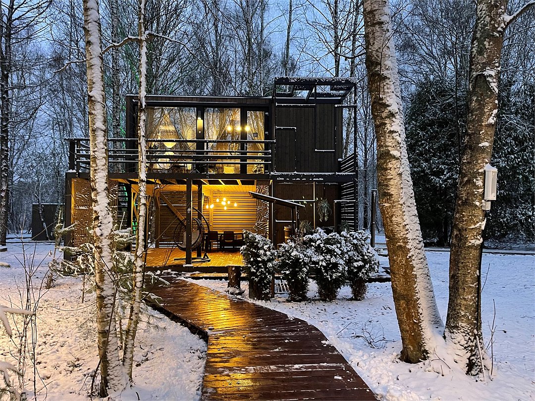 Wi-Fi, фен, микроволновая печь, душевая кабина, косметические средства, терраса, кровать «Queen size», две односпальные кровати, кухня, посудомоечная машина, кухонная посуда, мангал, панорамные окна, мини-холодильник, вид на озеро, вид на лес, общественный бассейн, система умный дом, проектор, умная колонка, можно с питомцамиВ коттедже