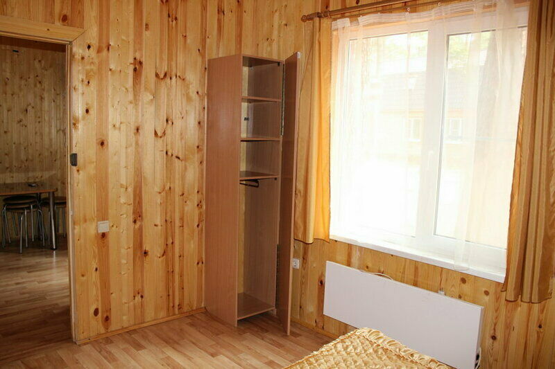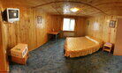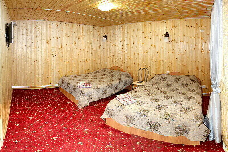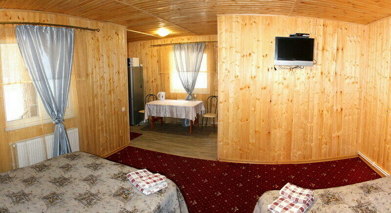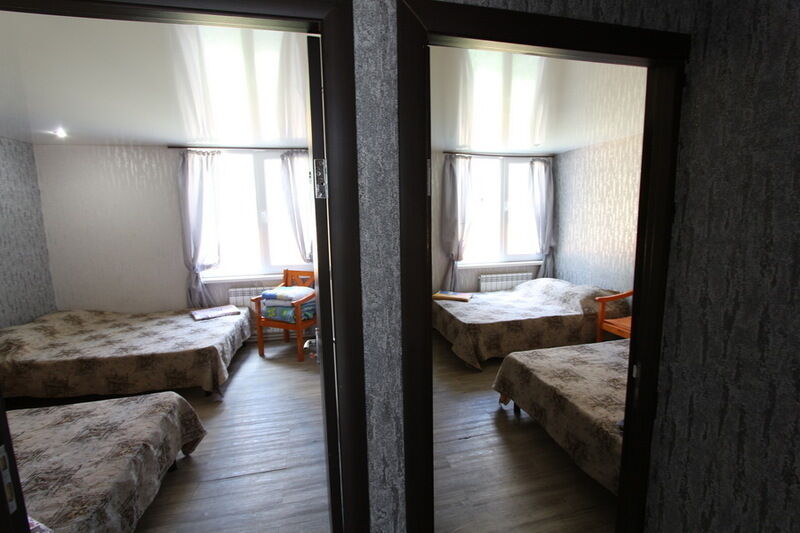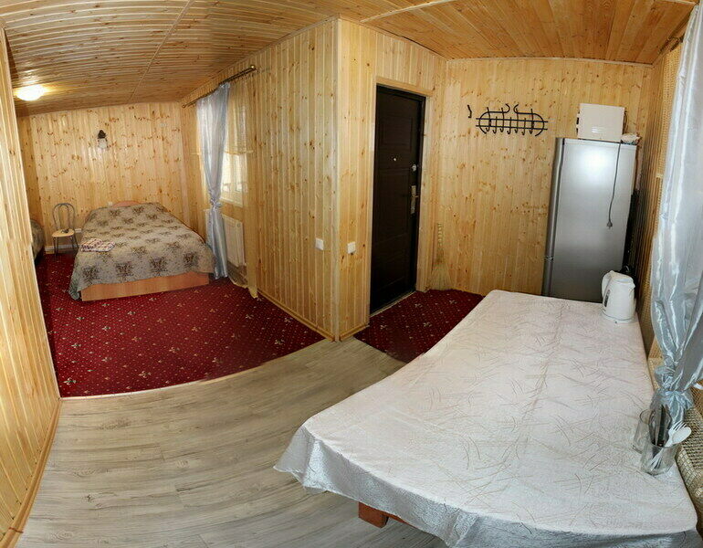 Двухэтажный коттедж на четыре изолированных номера. У каждого номера свой отдельный вход с улицы, на второй этаж ведут винтовые лестницы. В каждом номере две отдельные спальни.