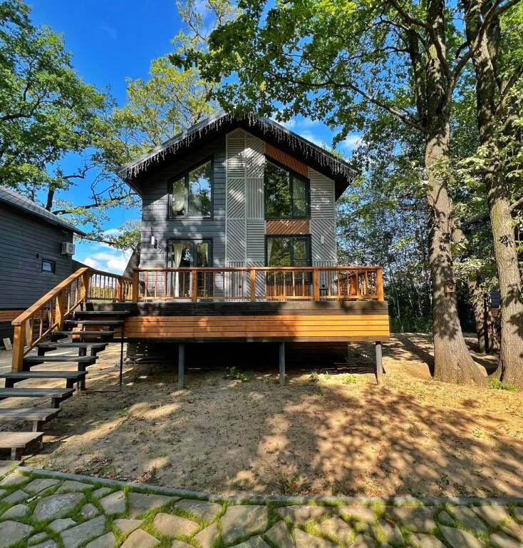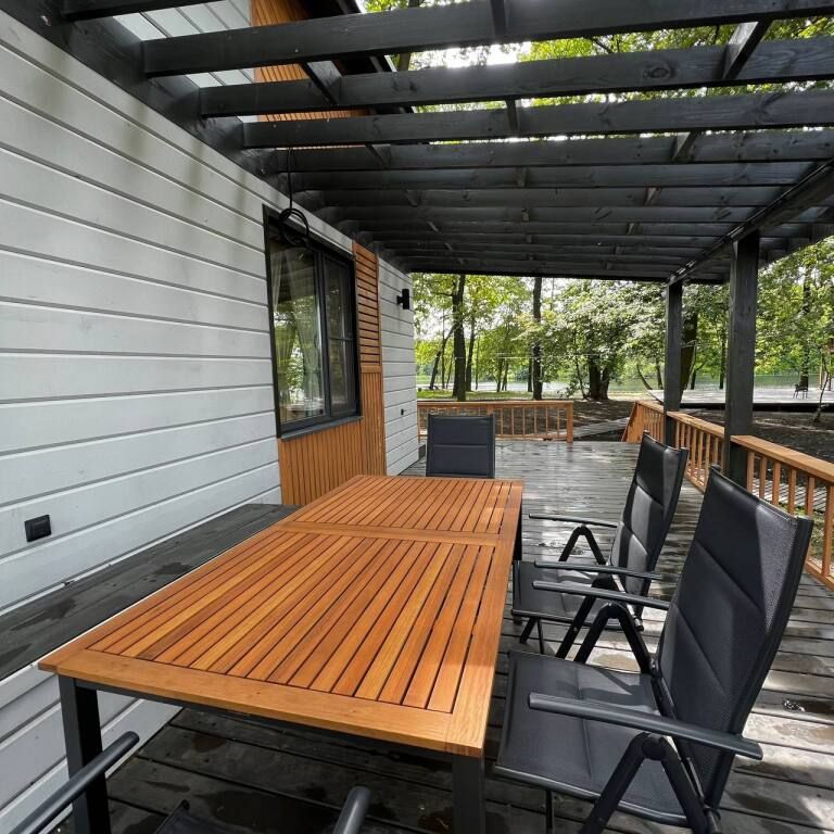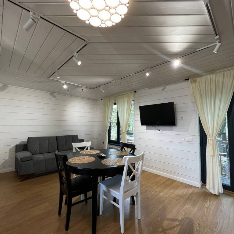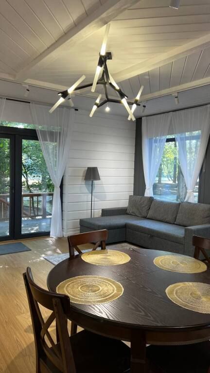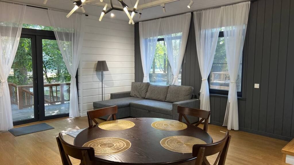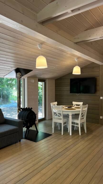 Просторный одноэтажный дом с большой зоной гостиной и кухни, тремя отдельными спальнями, камином и собственной террасой. Рассчитан на комфортное проживание до 8 человек. В доме один санузел. Собственная мангальная зона.