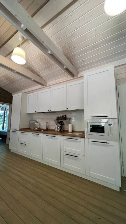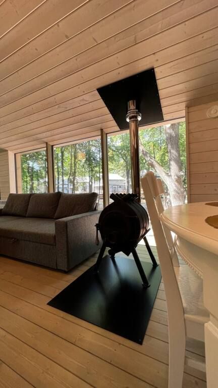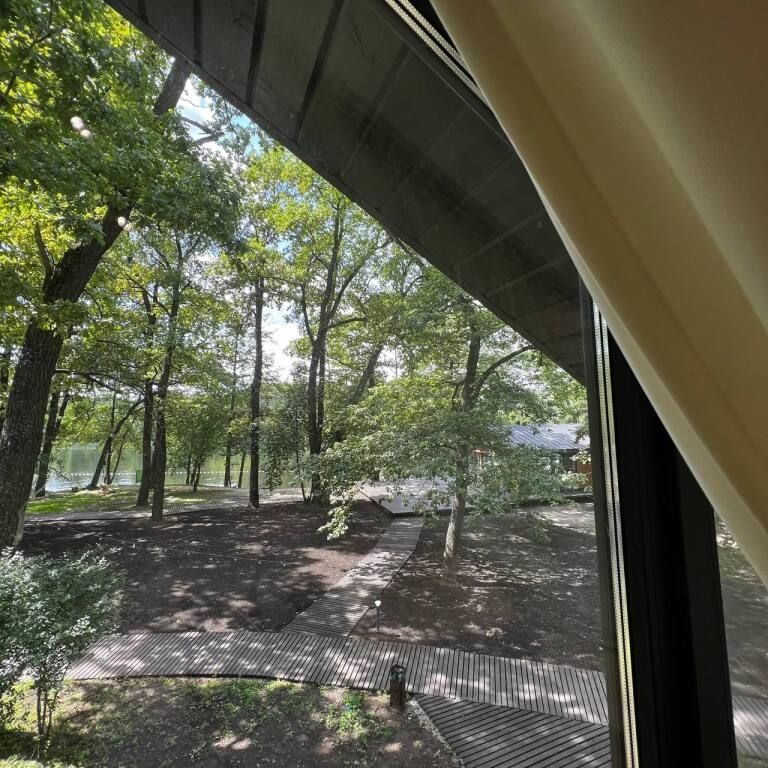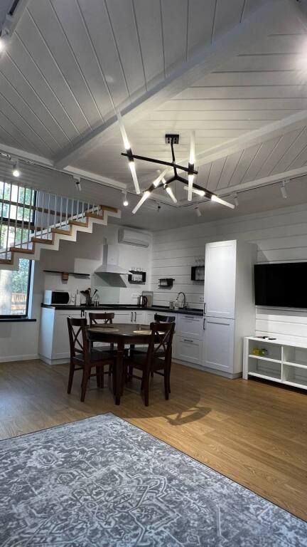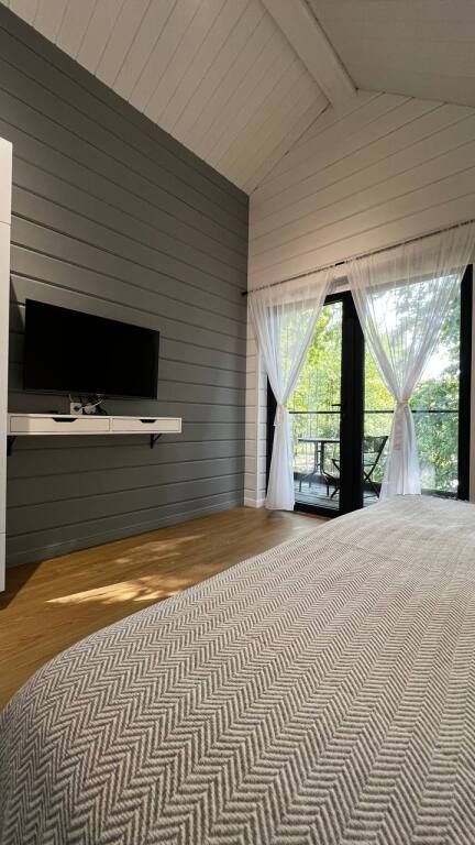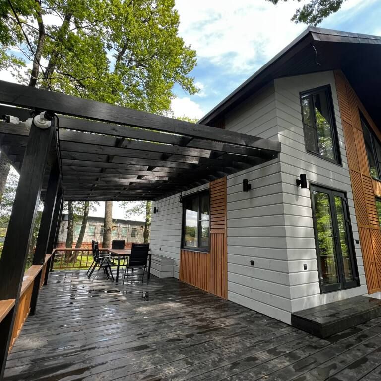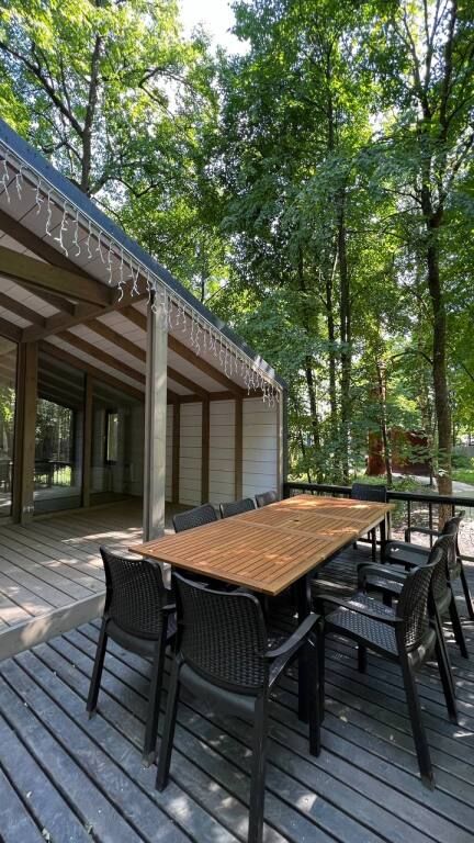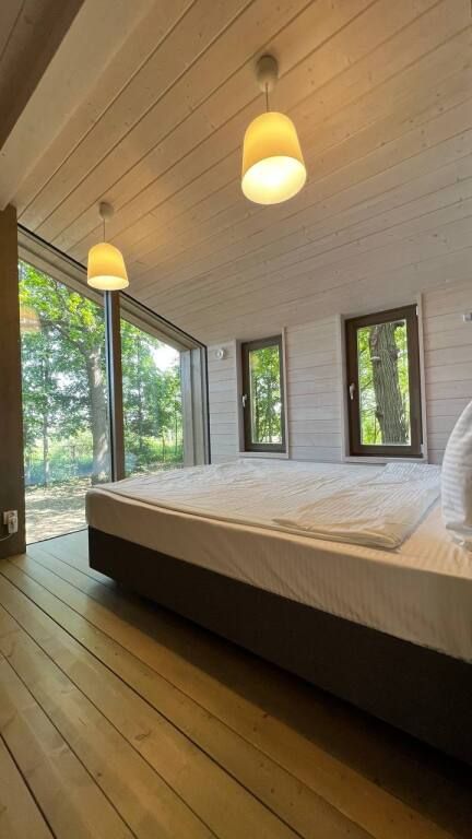 Просторный одноэтажный дом с большой зоной гостиной и кухни, тремя отдельными спальнями, камином и собственной террасой. Рассчитан на комфортное проживание до 8 человек. В доме один санузел. Собственная мангальная зона.