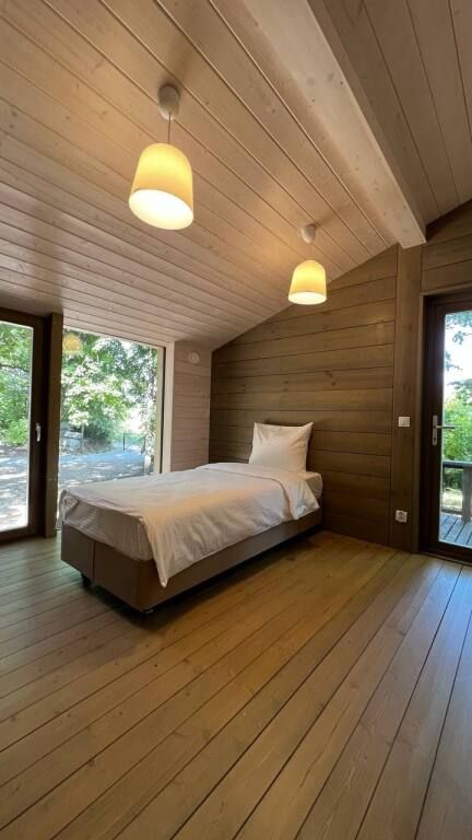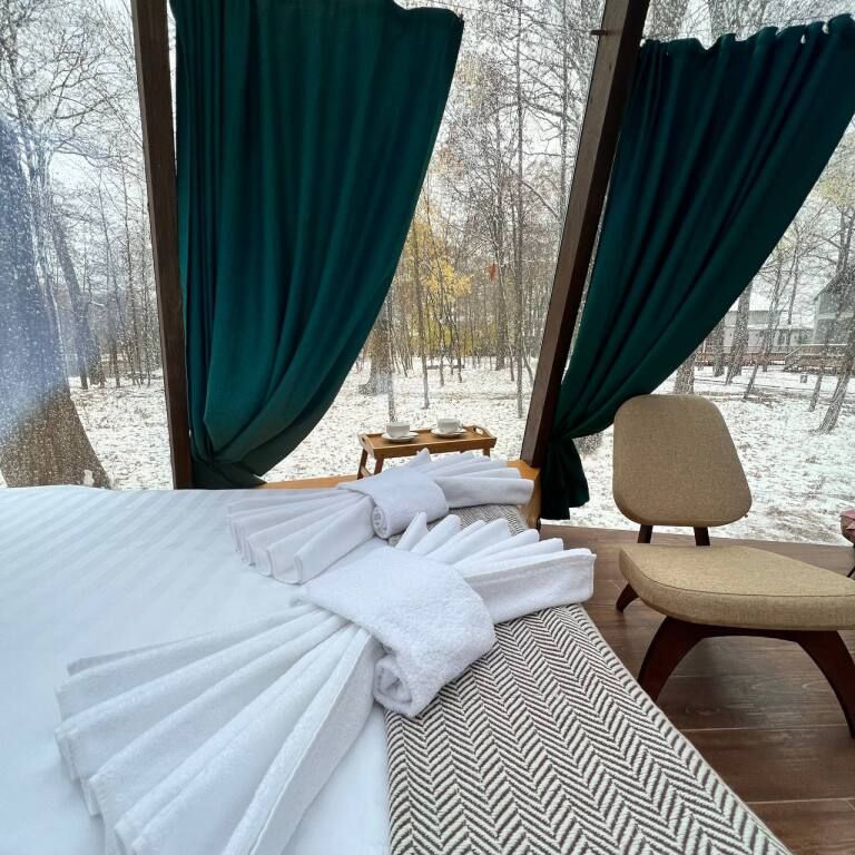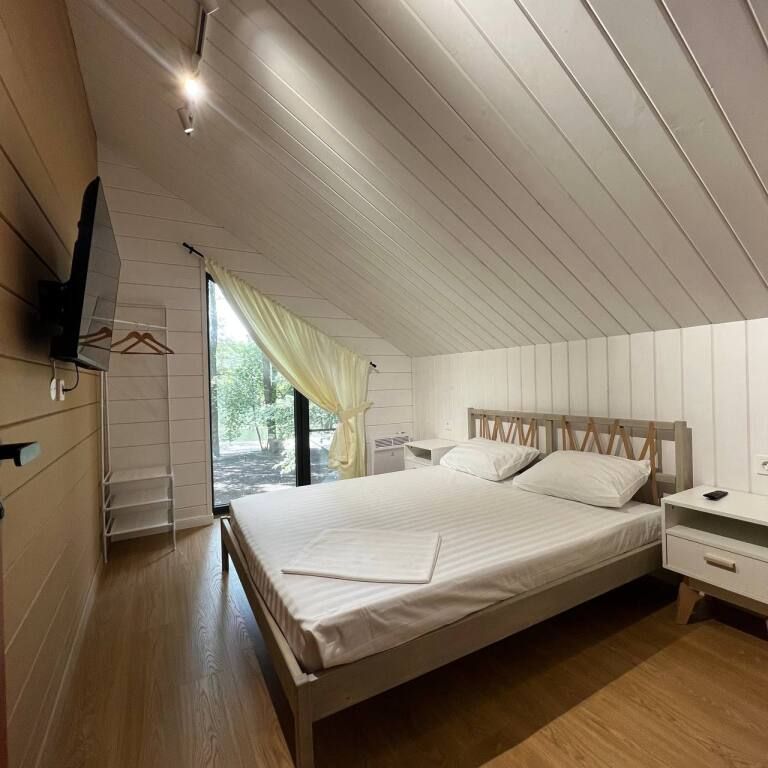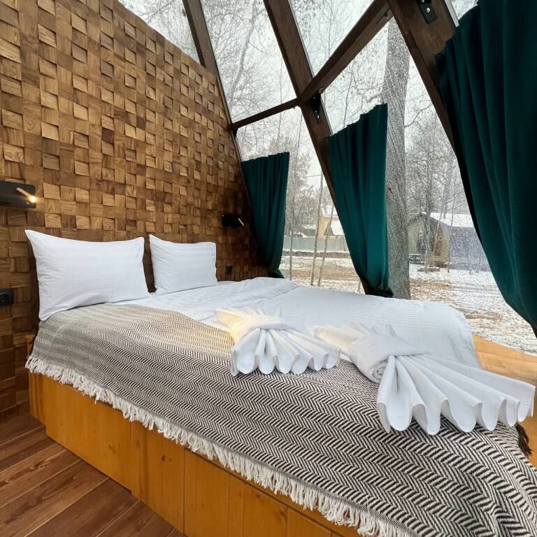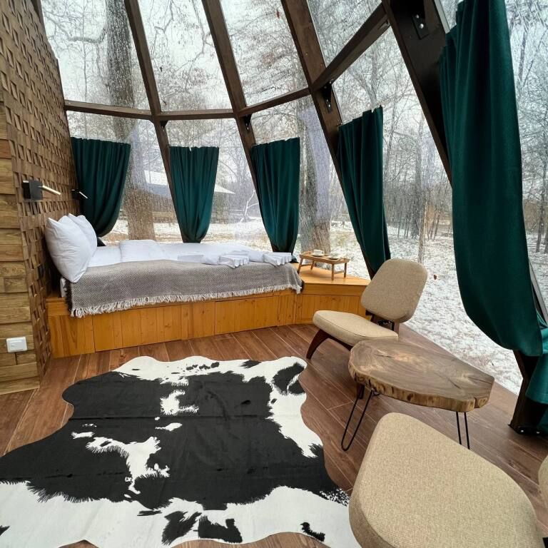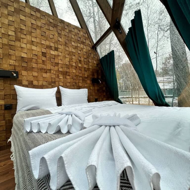 Эко-отель предлагает14 коттеджей, общей вместительностью от 52 до 74 человек. А именно: 7 больших двухэтажных коттеджей площадью 100 м2 , 3 двухэтажных дома поменьше, одноэтажный даблдом, витражный дом пирамида, дом на дереве и люкс для двоих.