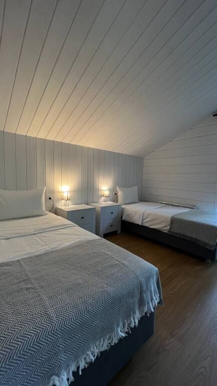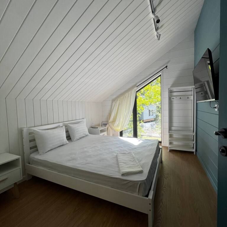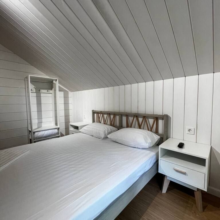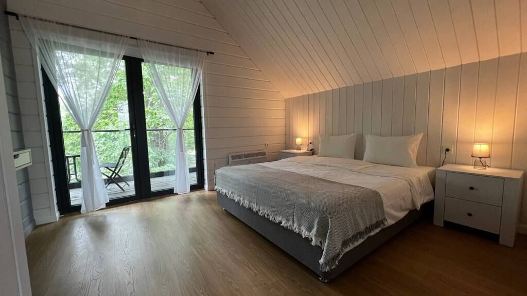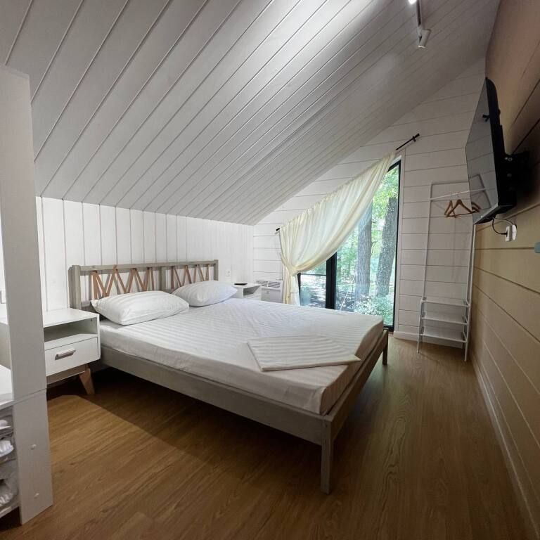 Просторный двухэтажный коттедж, в котором комфортно разместятся от 4 до 6 человек. В семейном коттедже большая зона гостиной и кухни на первом этаже, две спальни на втором этаже и собственная терраса . В доме два санузла. Собственная мангальная зона.