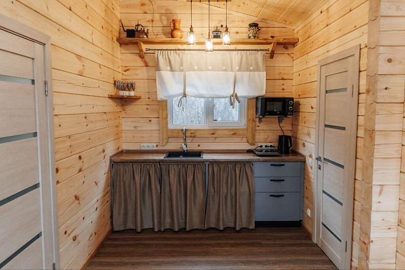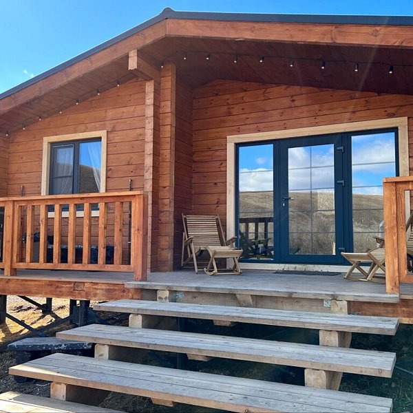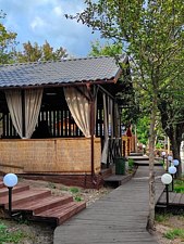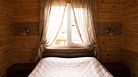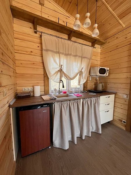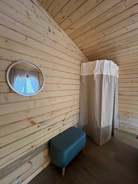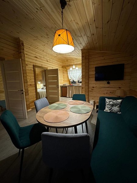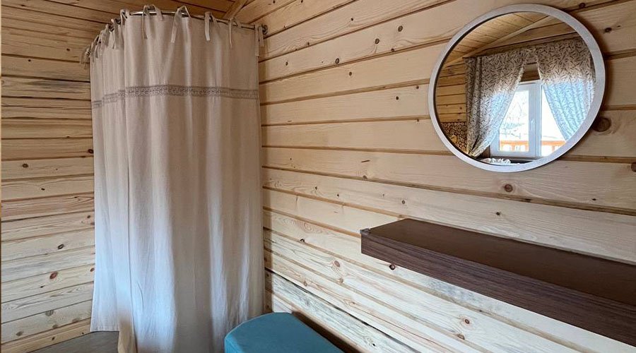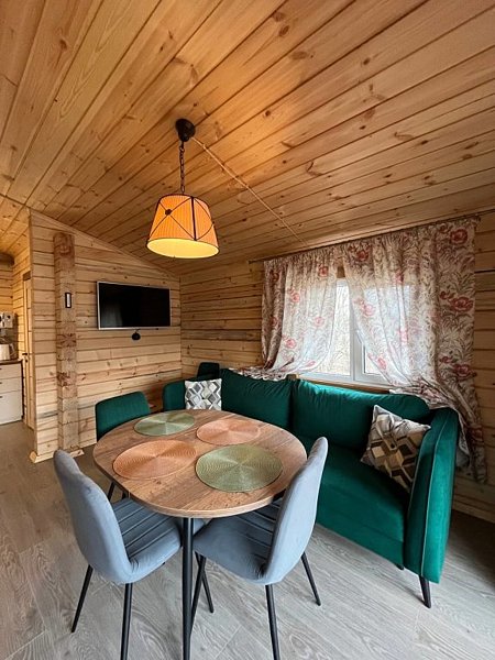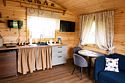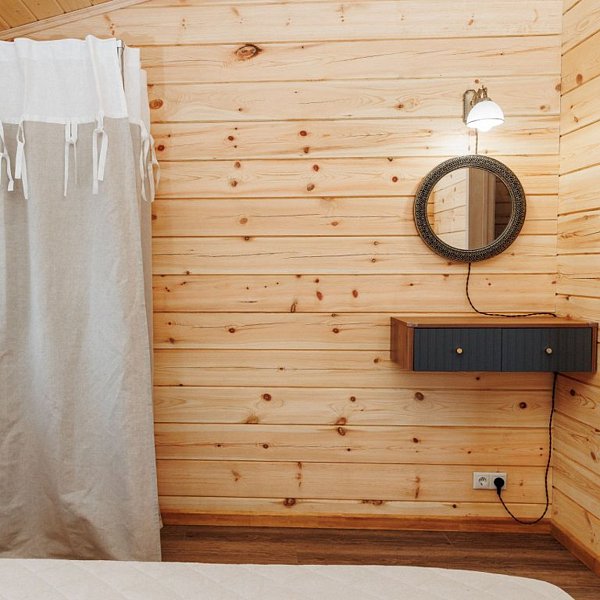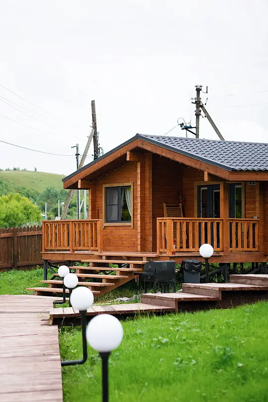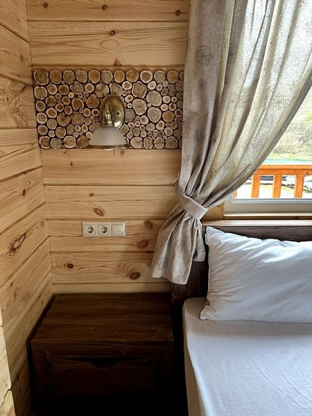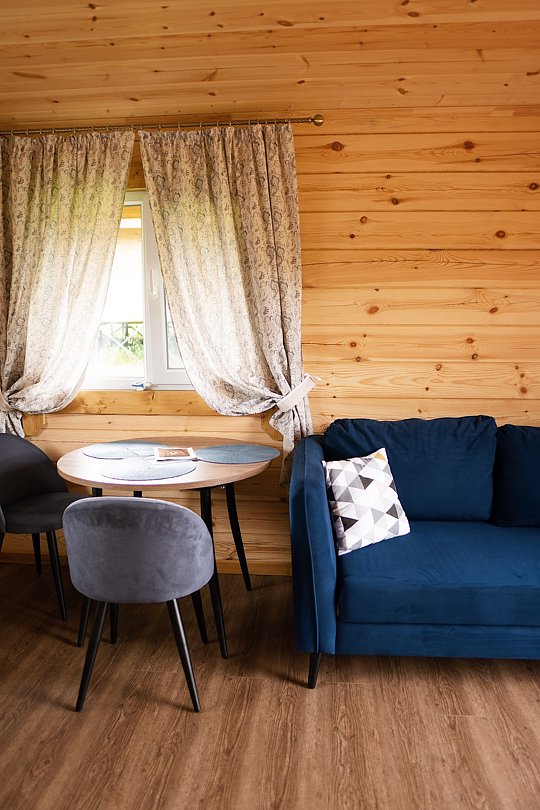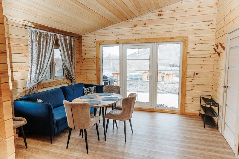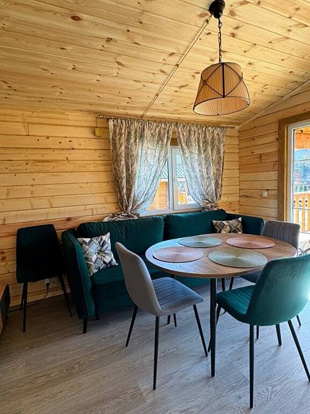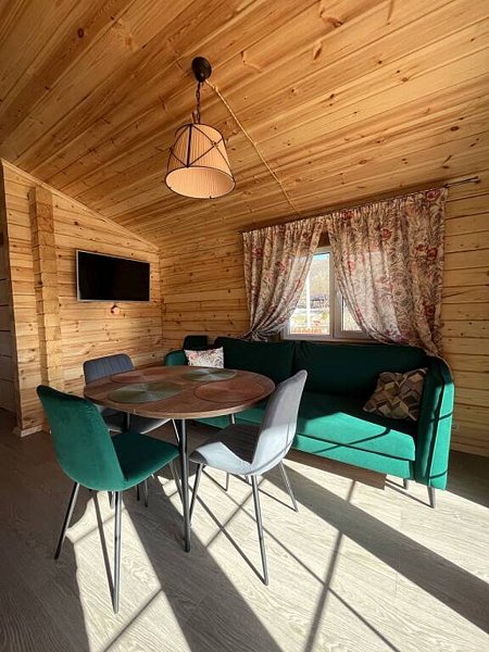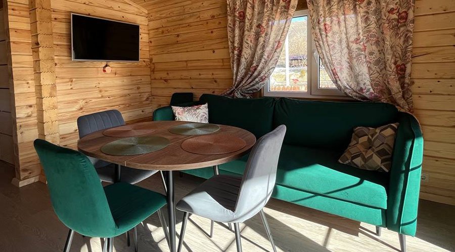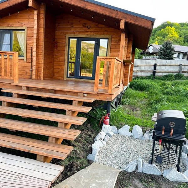 Представлены два больших деревянных домика и один маленький. У каждого есть выход на террасу и личная мангальная зона. Внутри установлена мягкая мебель, двуспальная кровать и есть ванная комната.